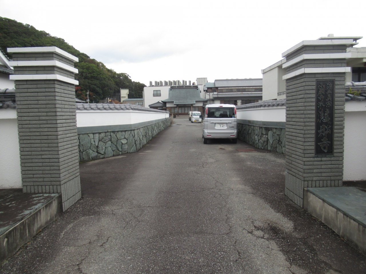 近代工法の御影石風の門の造りに続き、白壁が本堂まで連なっています。