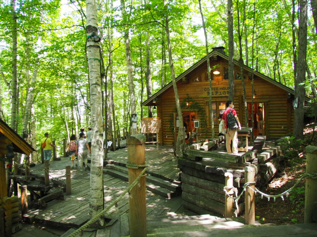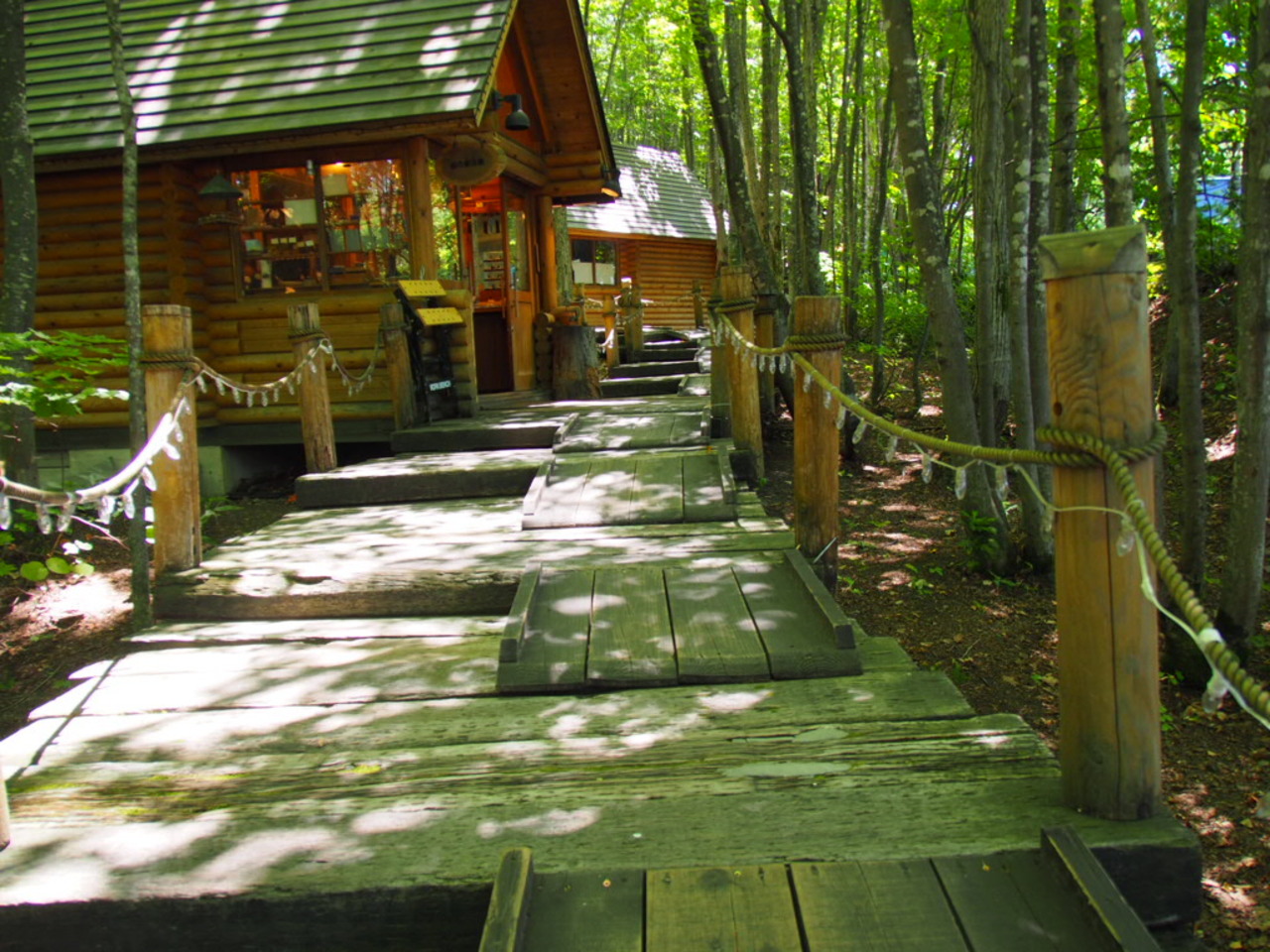 作家、倉本聰プロデュースの森の中、15棟のログハウスからなるショッピングエリア
