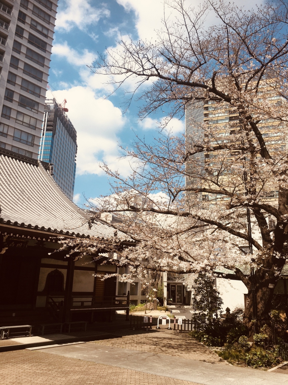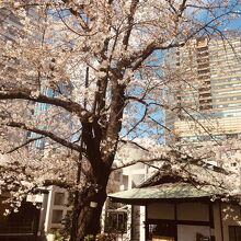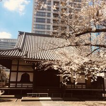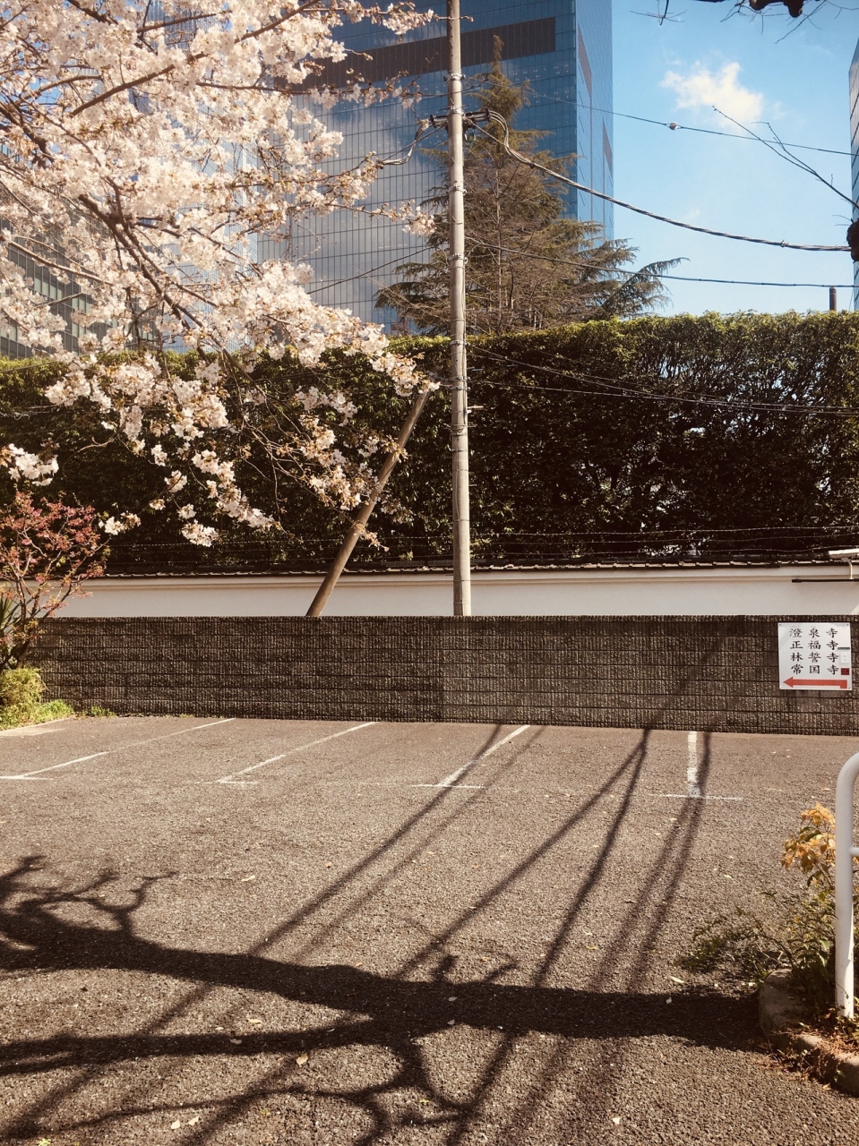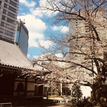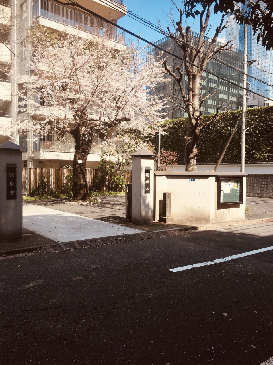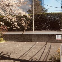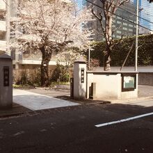 アメリカ大使館の裏側の道を挟んで隣にあり、前には教会がありました。すぐそばには警察官が警備していました。門がないので気軽に出入りできる、大きな桜の木があります。裏道にありながら桜の木目当てに人が幾人かいました。