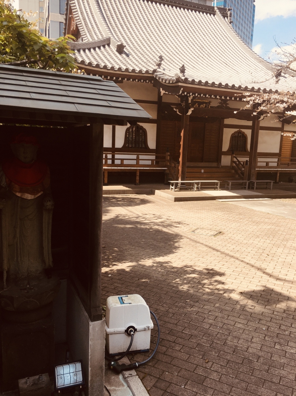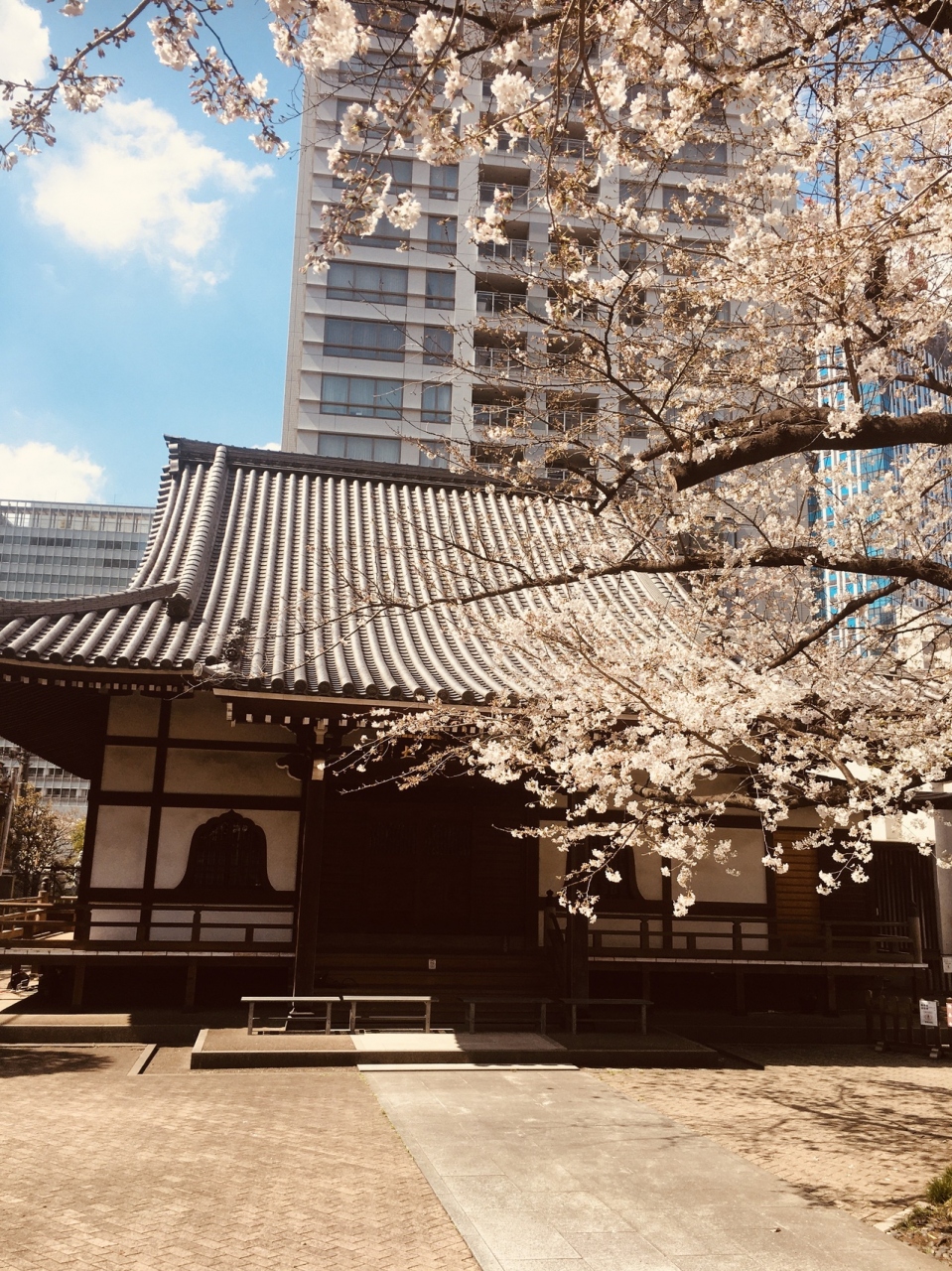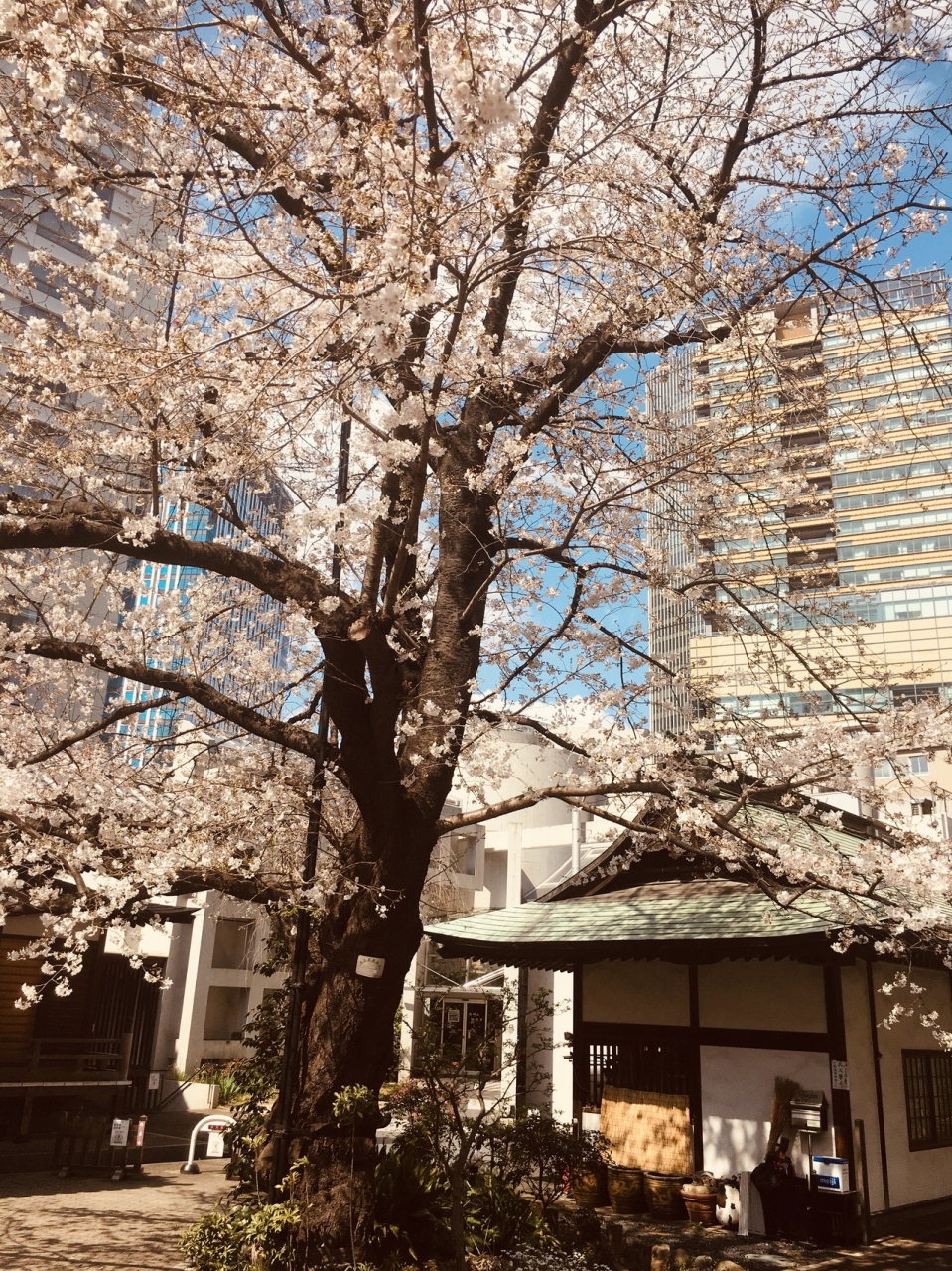 アメリカ大使館の裏側の道を挟んで隣にあり、前には教会がありました。すぐそばには警察官が警備していました。門がないので気軽に出入りできる、大きな桜の木があります。裏道にありながら桜の木目当てに人が幾人かいました。