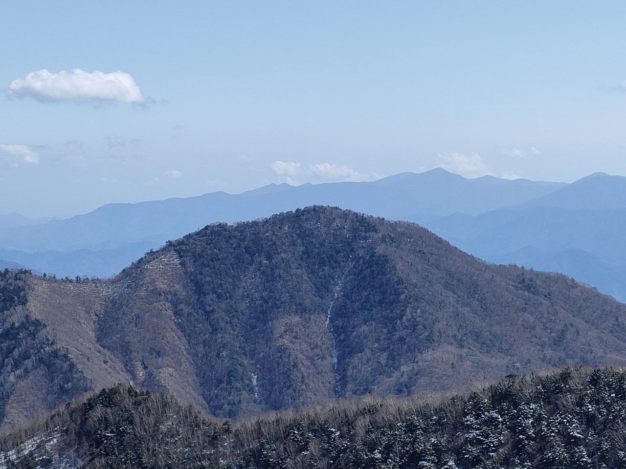 なお、冬期閉鎖と言っても、桑西(くわさい)配水池ゲートからの7.6kmの区間で、急カーブはあるものの、舗装はよくされていて歩きやすいので、ゲート横の広い駐車場に車を停めて歩くこともできます。冬場に訪れると、木の葉が落ちているので、登山の途中でも木々の隙間から周囲の景色が少し見えやすくなっています。