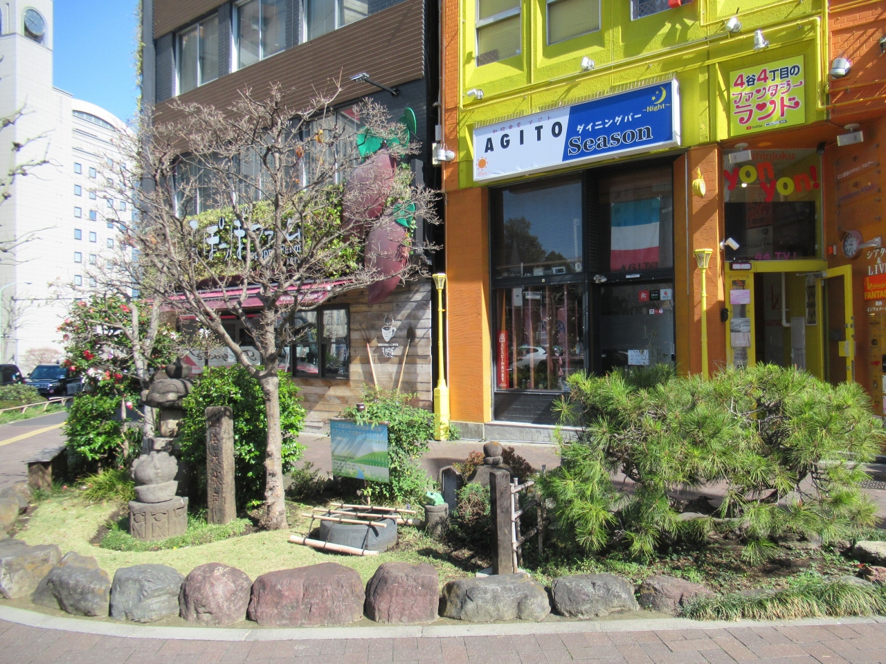 四谷三丁目駅から新宿通りを西へ進み、四谷外苑西通りと交わる四谷四丁目交差点にかわいらしい庭のようなものがあります。よく見ると低い石柱が立っていて、四谷大木戸と彫ってあります。左下諏訪宿と彫られた石柱もあります。低い松や椿やコブシが植えられていて、小さな石灯籠などがあり庭のようです。1616年に甲州街道の大木戸が設けられたのがこの場所だったようです。説明板はありませんでした。交通量の多い交差点にほっとする場所です。