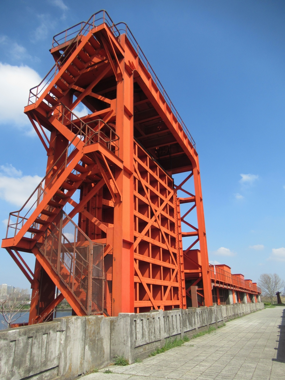 赤羽と川口をつなぐ新荒川大橋から荒川岩淵関緑地を通り700mほど行った、荒川と墨田川が分岐する場所に建てられた赤い水門です。長さ100mほど、5つの門扉がある鉄筋コンクリート製の水門で、大雨や台風の洪水から街を守るために大正時代に建てられました。現在は老朽化と地盤沈下のため役目を終え、200mほど先に造られた岩淵水門にその役目を引き継いでいます。遠方から眺めても美しく感じられましたが、歩いて間近まで行くとその大きさに圧倒されました。