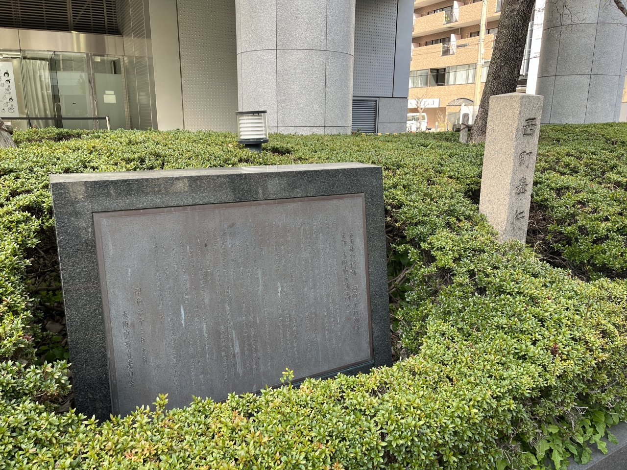 マイドームおおさかに用事があったときに、周辺を散策していたら植込みの中に石碑があるのを見つけました。時間の都合で石碑に書かれている内容をしっかり読み込むことはできませんでしたが、今も昔も人が集まる場所があり、歴史のつながりが感じられました。