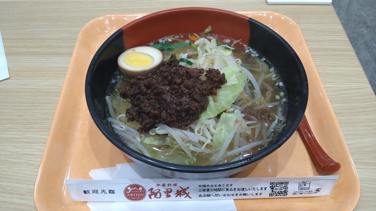 お台場の大型商業施設・アクアシティお台場1階フードコートにある中華料理屋さんです。夕食で台湾風挽肉入りラーメン790円をいただきました。具は味付き肉ミンチ、キャベツ、モヤシ、ゆで卵半分、ニラ、ねぎで、柔らかい縮れ麺と、透き通ったスープの一品です。スープの味は薄めでしたが、独特な旨味があり、美味しかったです。