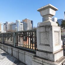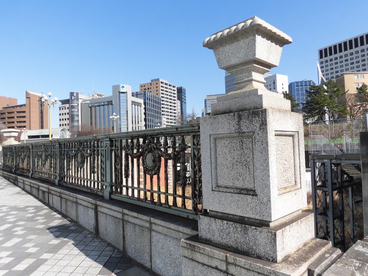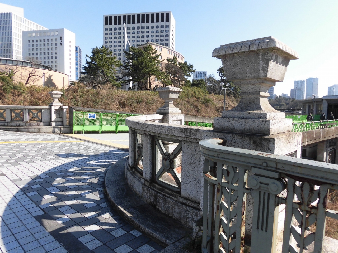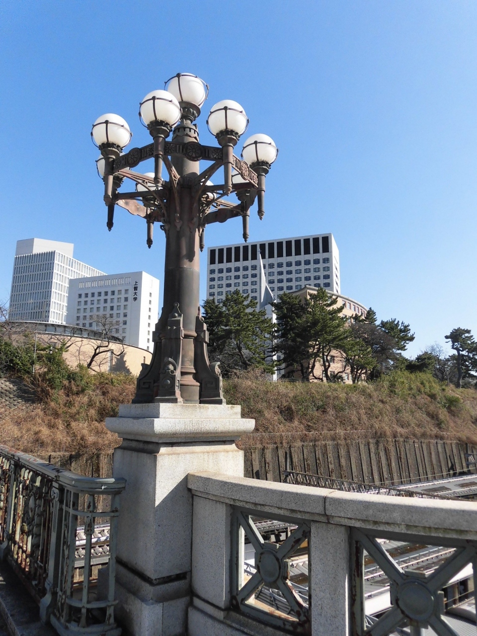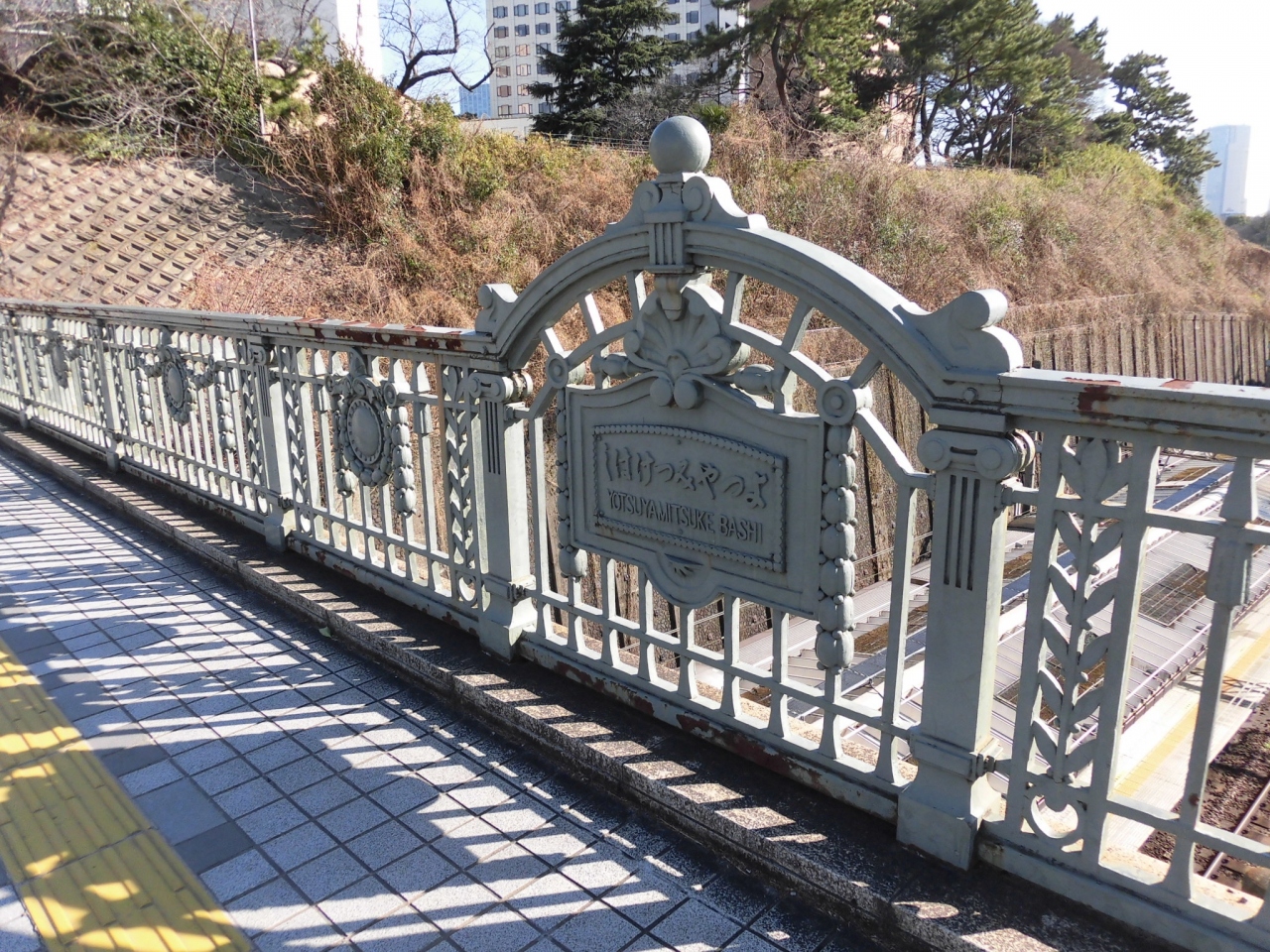 JR四ツ谷駅に行った時に渡った橋です。下に中央線が通っています。駅前なので多くの人が橋の上を行き交っていて、とても賑やかな橋でした。欄干部分や親柱や照明のデザインが、レトロな雰囲気でした。橋の中央の橋名が右からの表示なのも、歴史が感じられてよかったです。