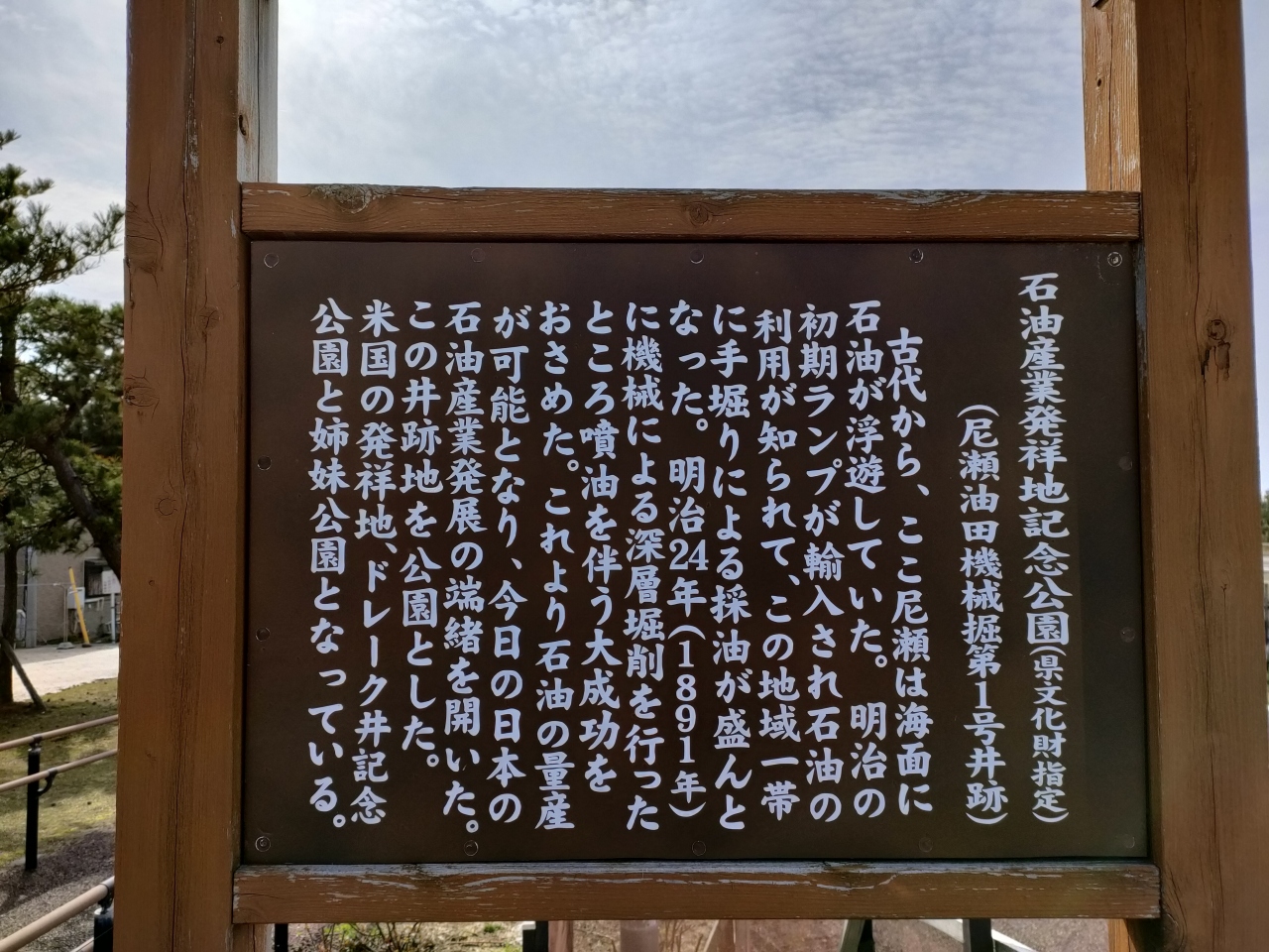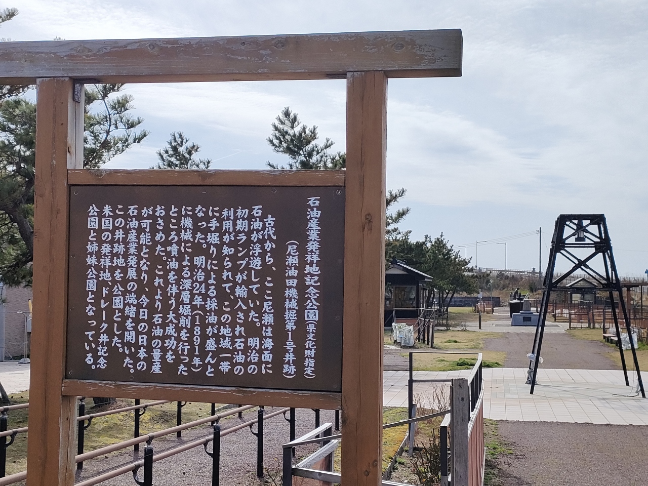 日本でも新潟でわずかに石油が採れることは知られていますが、改めて訪れて解説板を読んでみると、その歴史や採掘の様子などを知ることができてよいです。