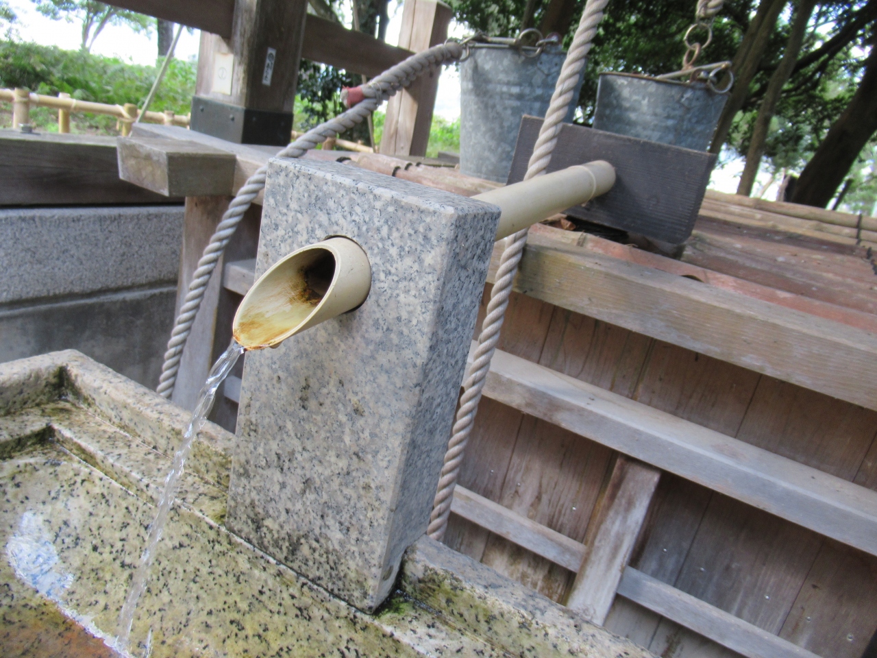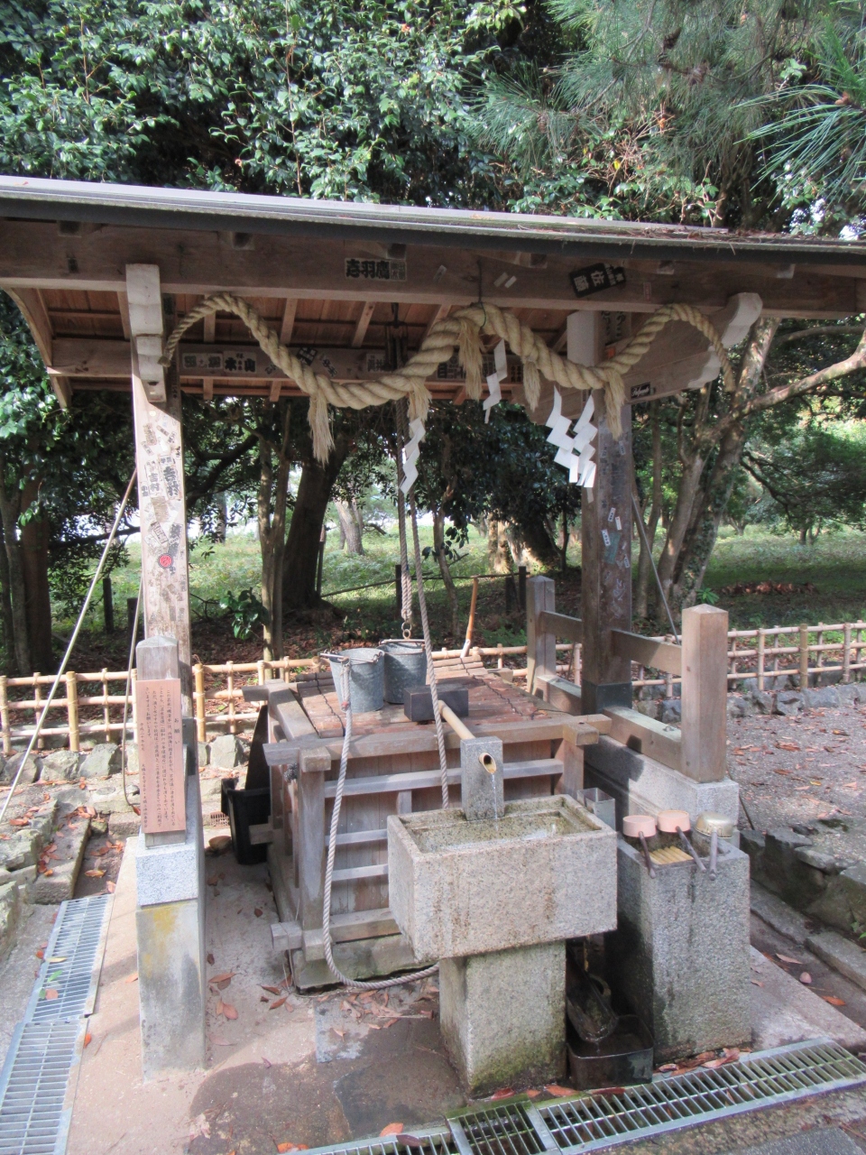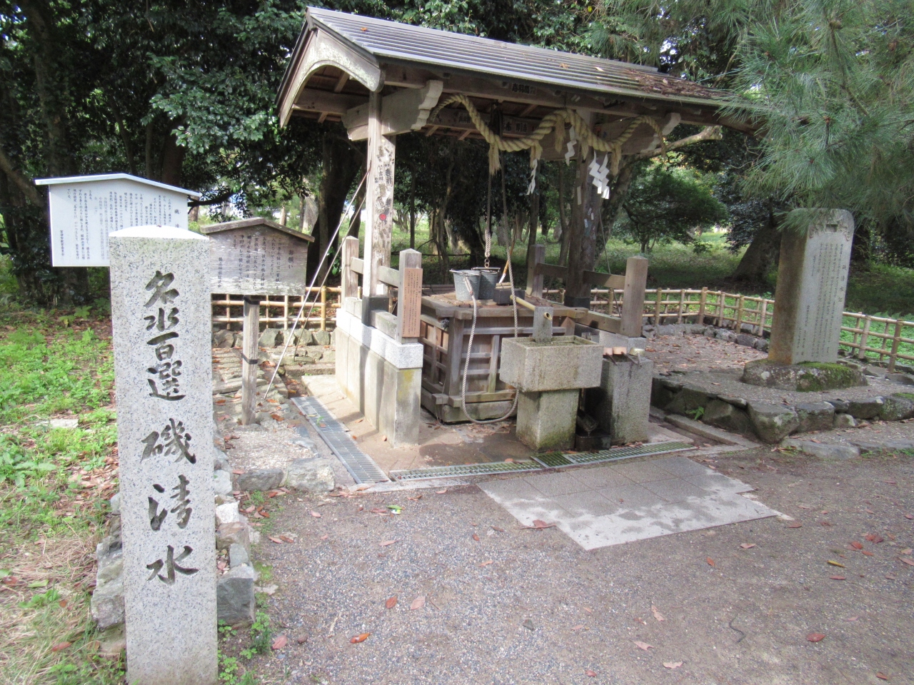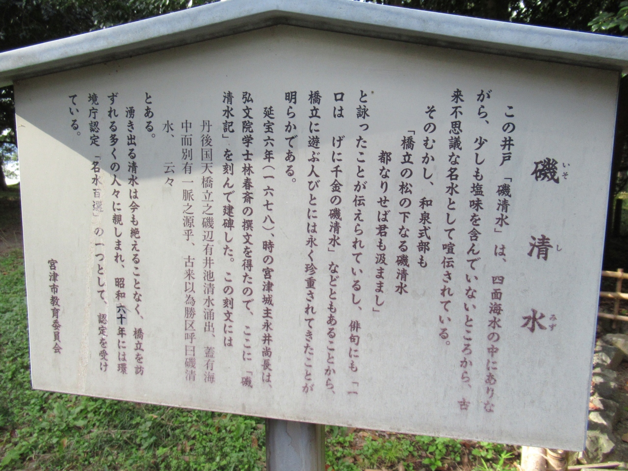 磯清水は、京都府宮津市の宮津湾と内海の阿蘇海を南北に隔てる長い湾口の砂州である天橋立の中間あたりにある水が湧いている井戸で、すぐ隣に天橋立神社があります。