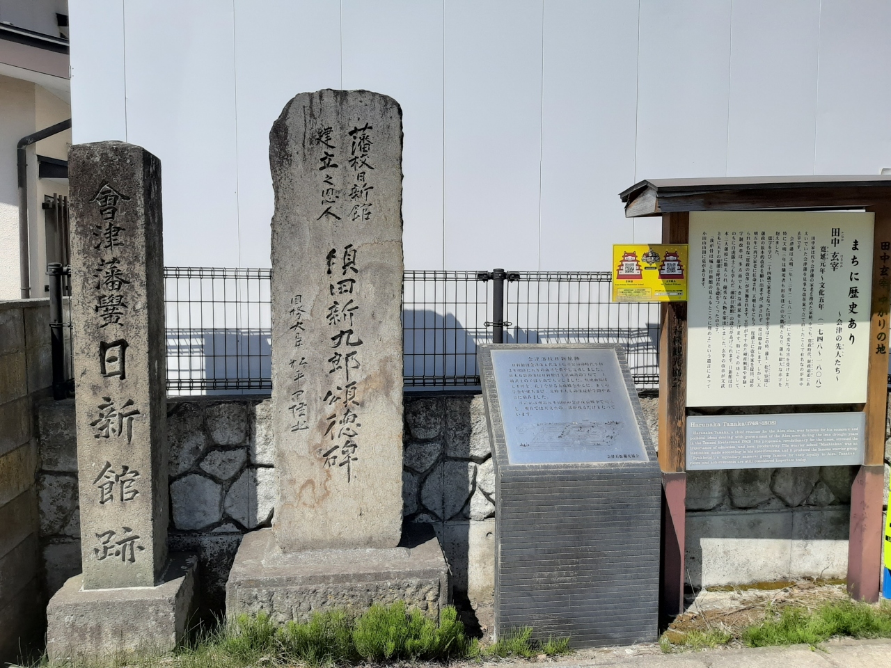 日新館の展示施設は、会津若松市郊外の高台に移設されていますが、会津藩時代の日新館があったのは今の鶴ヶ城の目の前で、お堀の西側を通る大通り(北に行けば若松駅)沿いに、日新館跡の碑のみが残っています。