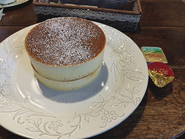 バターとメープルシロップが2個ずつ付いていました。2段重ねなので、ちょっと食べ方に悩みます。味は口コミ通り、優しい感じのホットケーキでした。家で焼くのとは違い、キメは細かく美しいです。さすがプロ。1個半くらいでお腹が膨れて来ました。