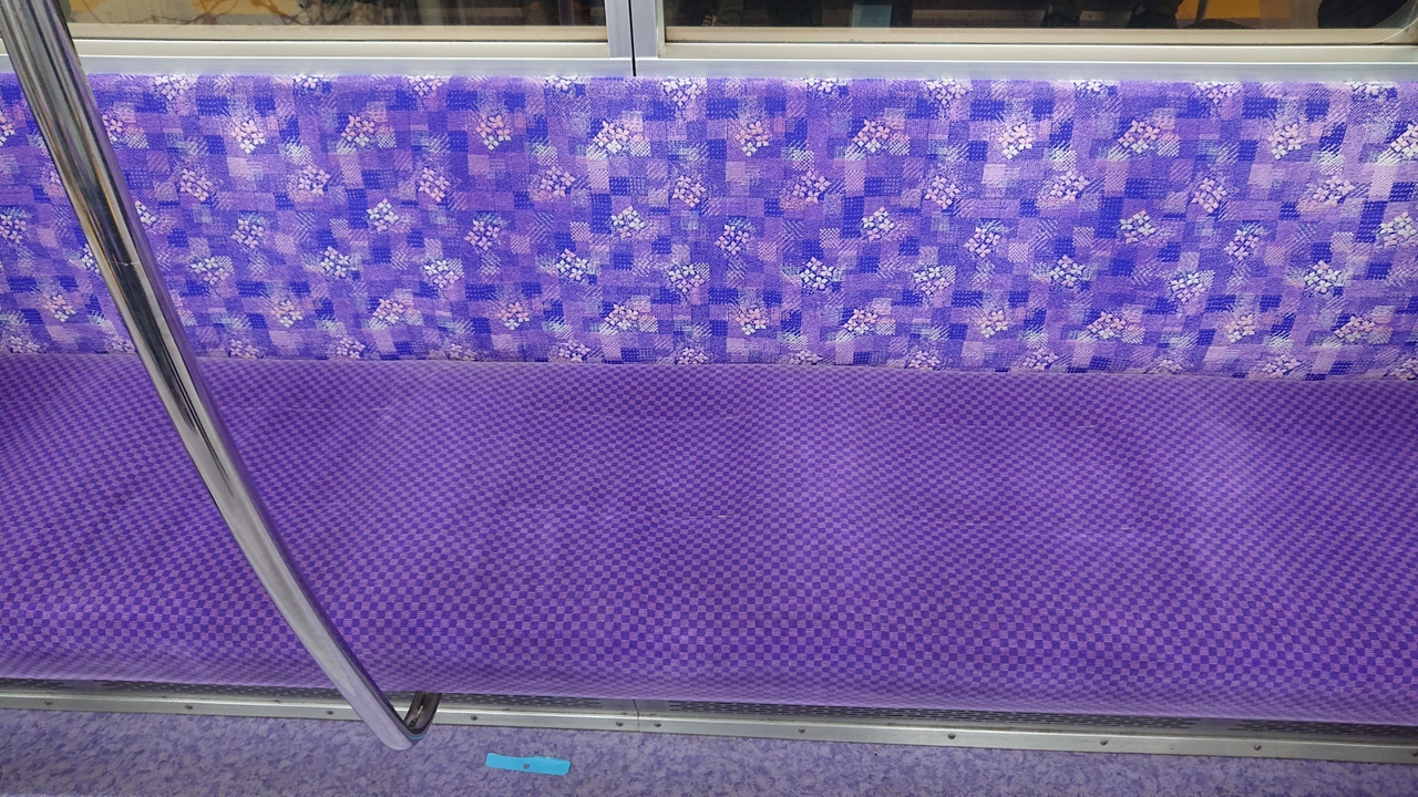 3月下旬の週末の午後6時台に、普通渋谷行きに、永福町駅から乗車しました。車内は紫色のロングシートが基本でした。その、ロングシートには花の模様があり、素敵でした。車内にお客さんは結構乗っていましたが、急行と比べると、空いている印象を受けました。