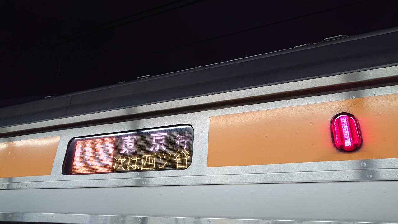 3月下旬の週末の午後6時台後半に新宿駅発の、快速東京行きで、終点の東京駅まで乗車しました。ちょうど卒業式のシーズンとあって、車内にはその帰路と思われるる集団も見受けらるる等、車内は賑やかでした。お客さんは一定程度は乗車していましたが、やや立ち見客が出る程度で、混雑まではしていませんでした。