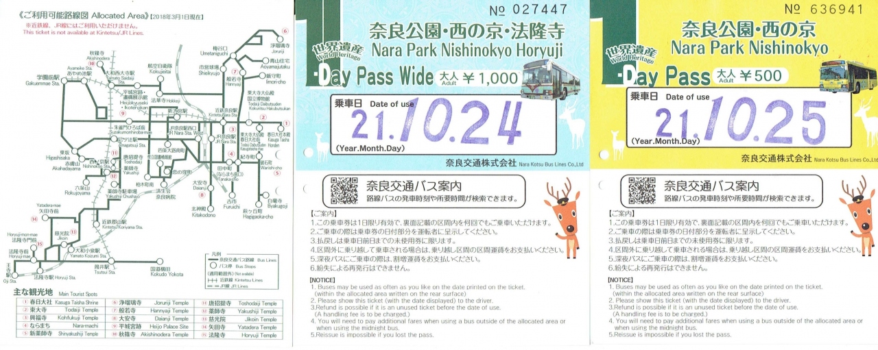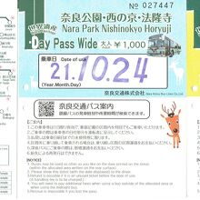 JR奈良駅改札を出たところにある窓口で、事前に奈良公園・西の京 世界遺産 1-Day Pass と奈良公園・西の京・法隆寺 世界遺産 1-Day Pass Wideを購入しました。購入時点でいつどのフリー乗車券を利用するのかを申告し、Passに乗車日を押印してもらっての購入となり、日付欄白紙の状態では購入できないので要注意です。フリー乗車券を提示すると、お寺などの観光スポットやお土産店、レストランで割引サービスを受けられます。