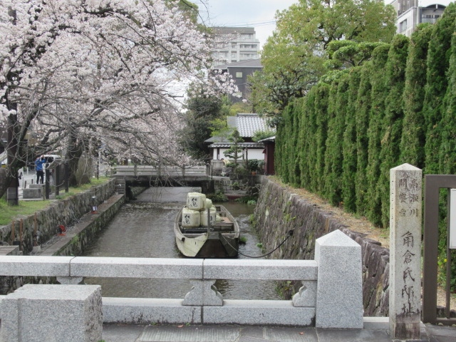 「押小路橋」は河原町通から押小路通を東へ木屋町通り手前にある高瀬川に架かる橋です。この付近は「一之船入」と言われ鴨川から荷の積み下ろしの為に造られた高瀬川の源流になります。ここで荷を降ろしさらには下流の船入へとそして伏見へと運んだのでしょうか。桜も開花し風情がありますね。さぁ木屋町沿いを散策しましょう多く見どころ京の歴史を見ることができます。