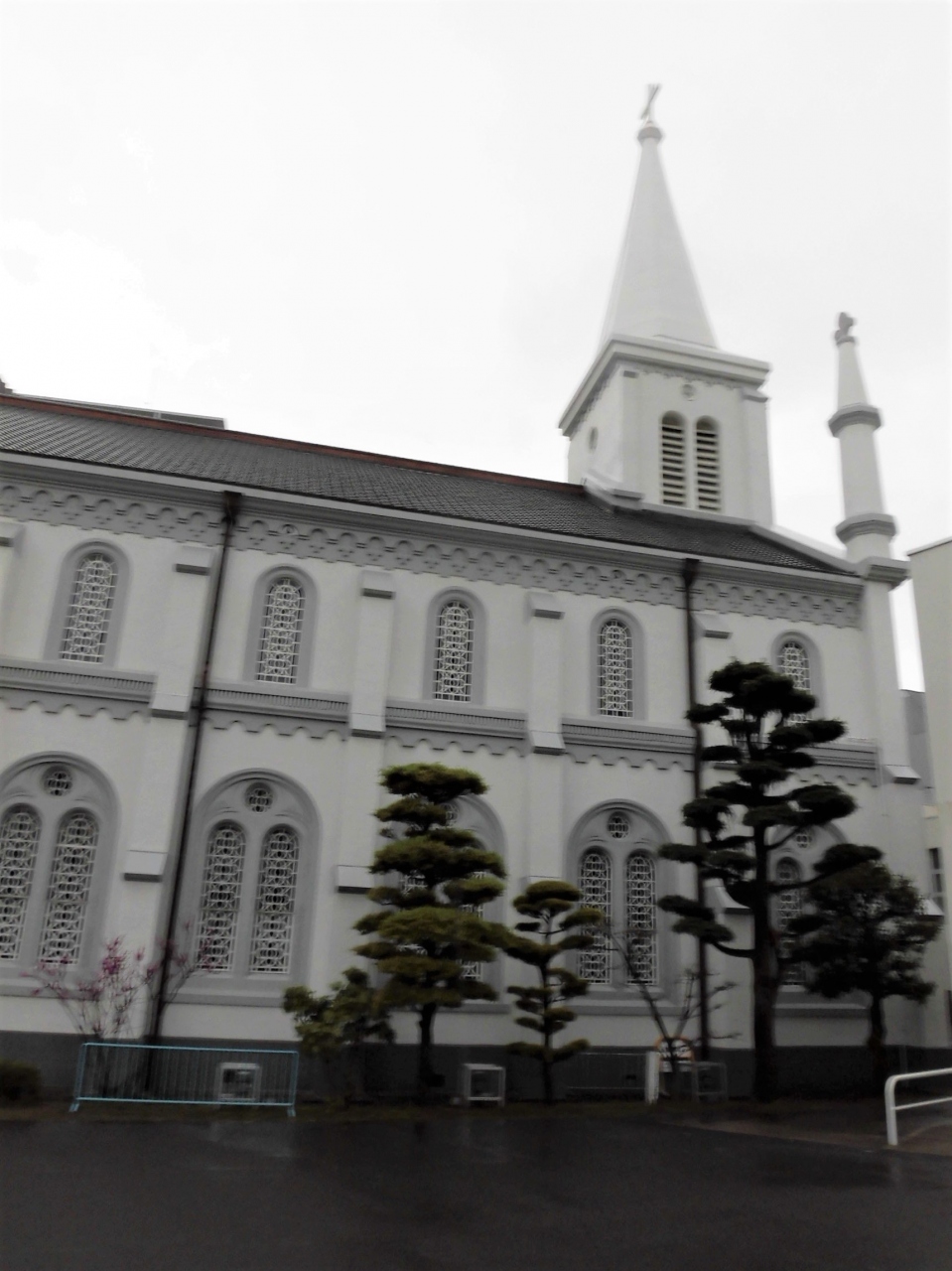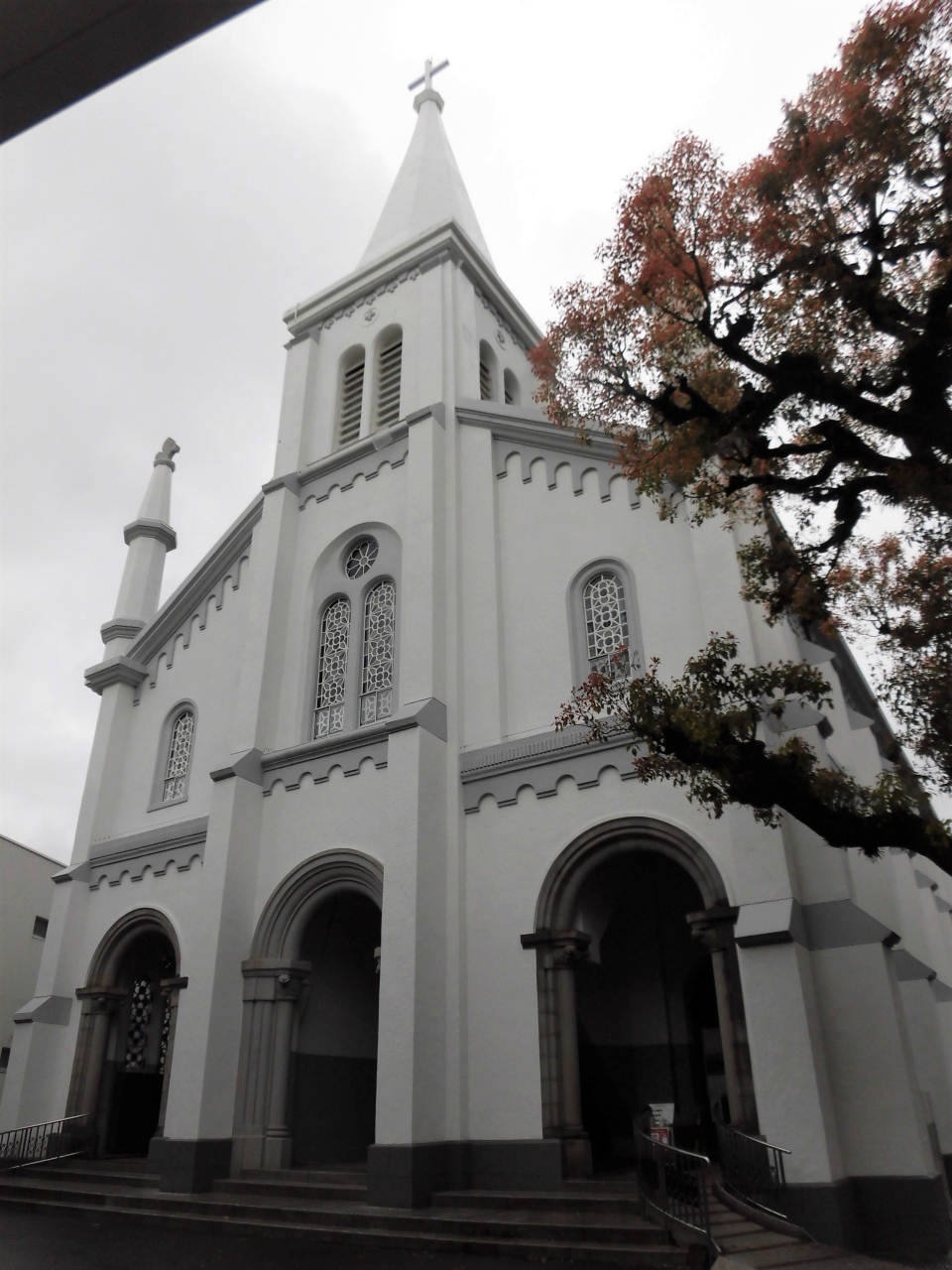 JR長崎駅から歩いて数分のとろろにあり、巨大な尖塔がビルの谷間から見える白亜の美しい教会です。