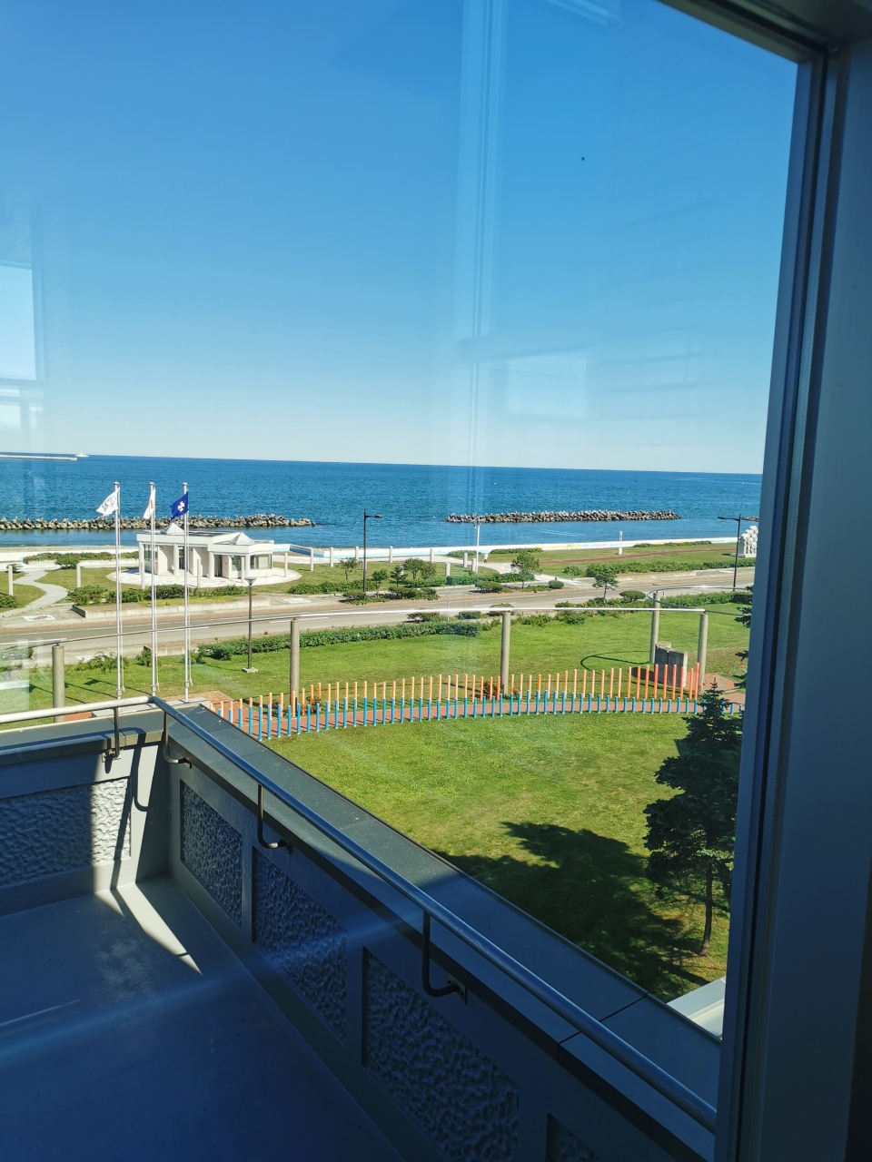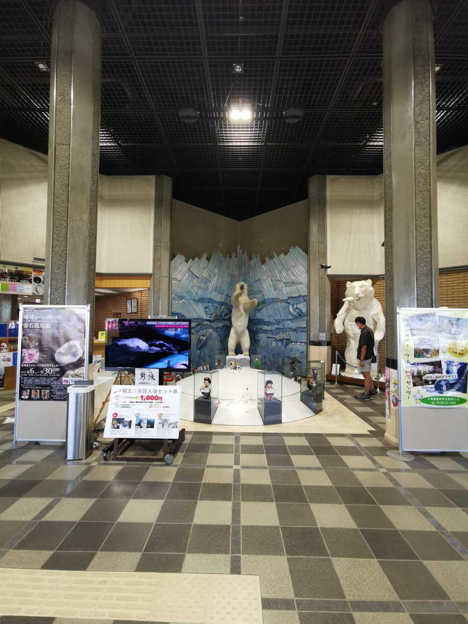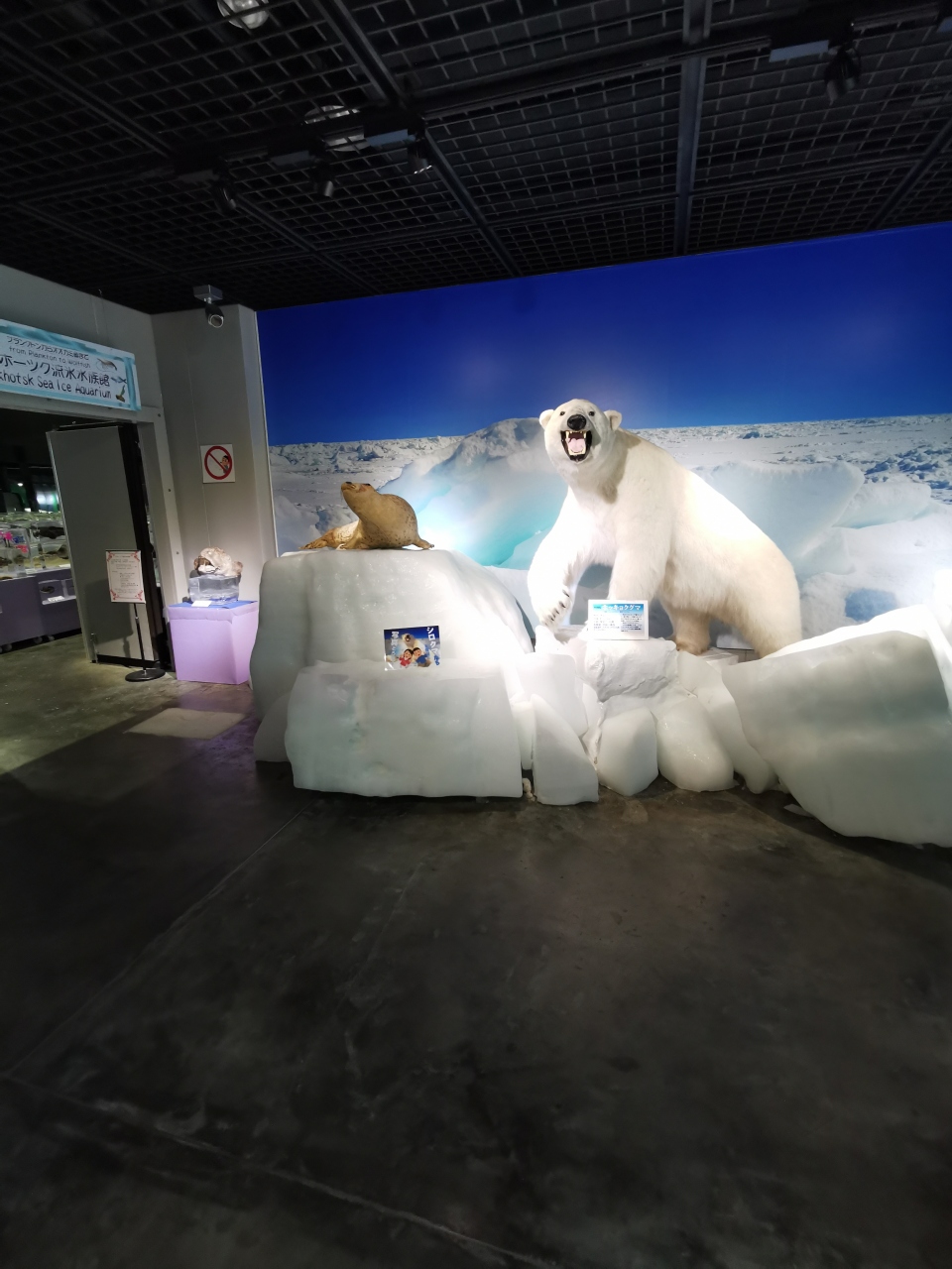 北海道立オホーツク流氷科学センターは、流氷に関する展示施設ですね。入り口はホッキョクグマの剥製があります。地下に降りると、マイナス気温を体感出来る冷凍室展示室があります。氷付けされた魚が多数ならんでいます。ここだけでも十分に来たかいがあります。上階の展望室からはオホーツク海が一望できます。