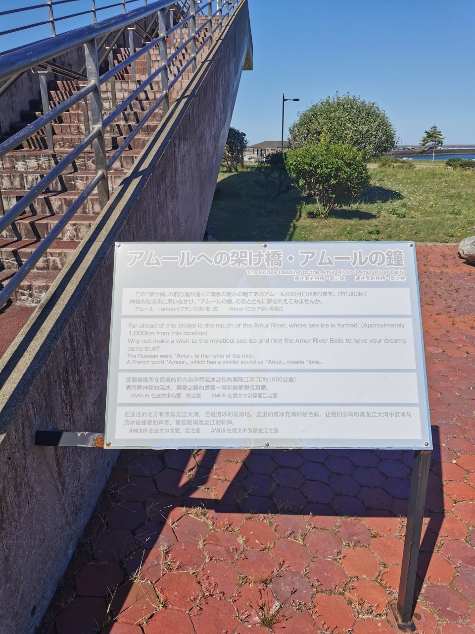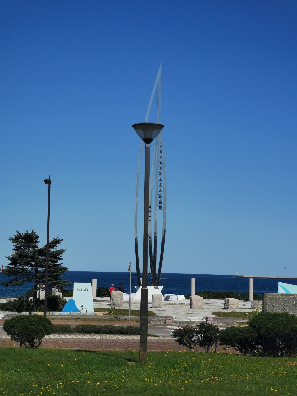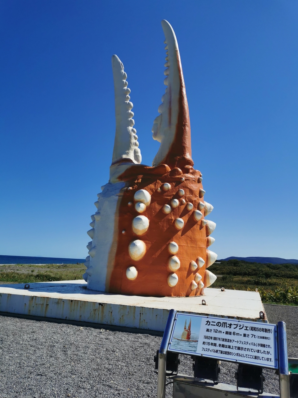 道の駅 オホーツク紋別に車を停めて、北海道立オホーツク流氷科学センターを見学しました。センターの前にある綺麗なオホーツク海が一望できる公園がカリヨン広場です。アムールへの架け橋・アムールの鐘があって、遠くロシアとつながっているのだなと思いました。海岸沿いにテレビで見た事のある、巨大なカニの爪 オブジェもあって、なかなか見所がありました。