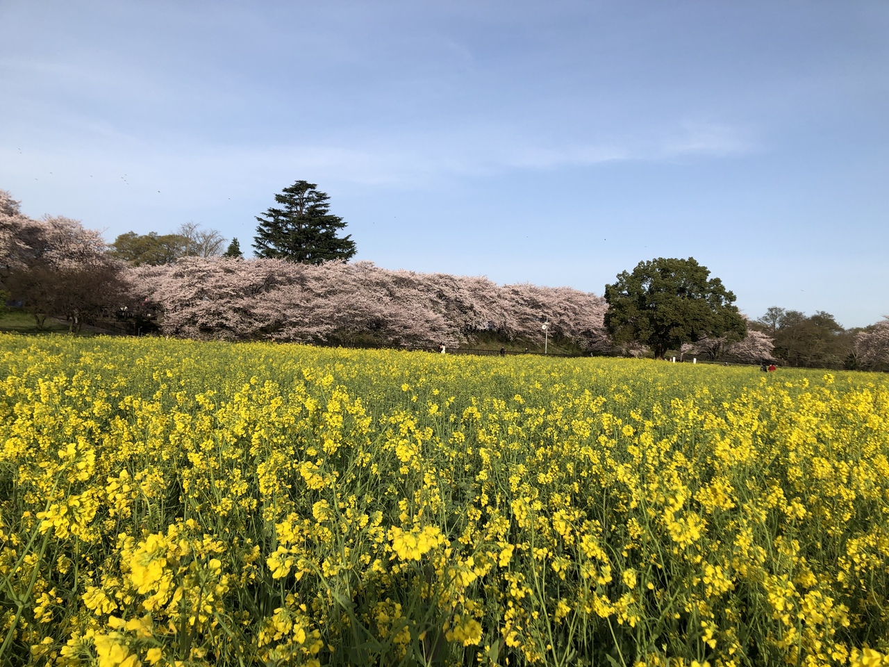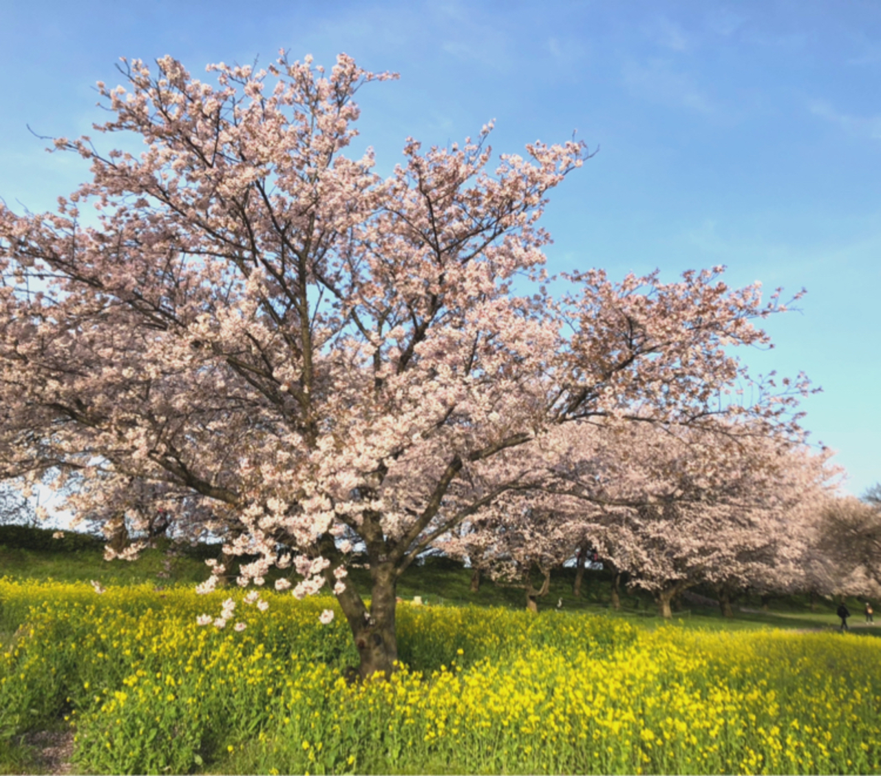 土手下の菜の花畑はまだ満開には至っていませんが、菜の花の黄色、桜色に青空の春のトリコロールケは今年も綺麗でした。