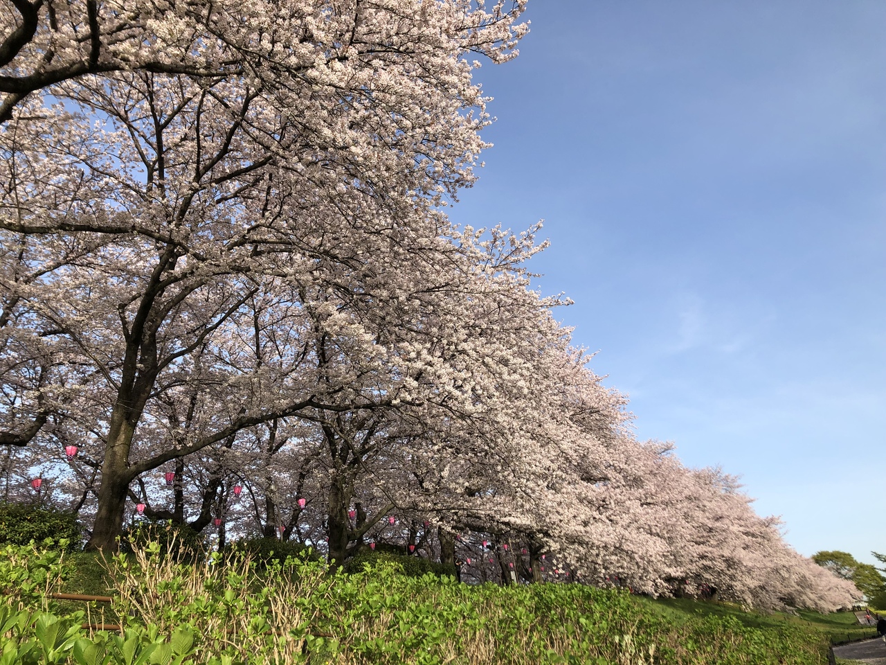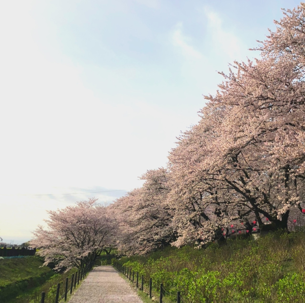 幸手権現堂公園の桜堤では1kmの土手上の桜並木が満開となり、桜色の川が流れるような光景が見られます。