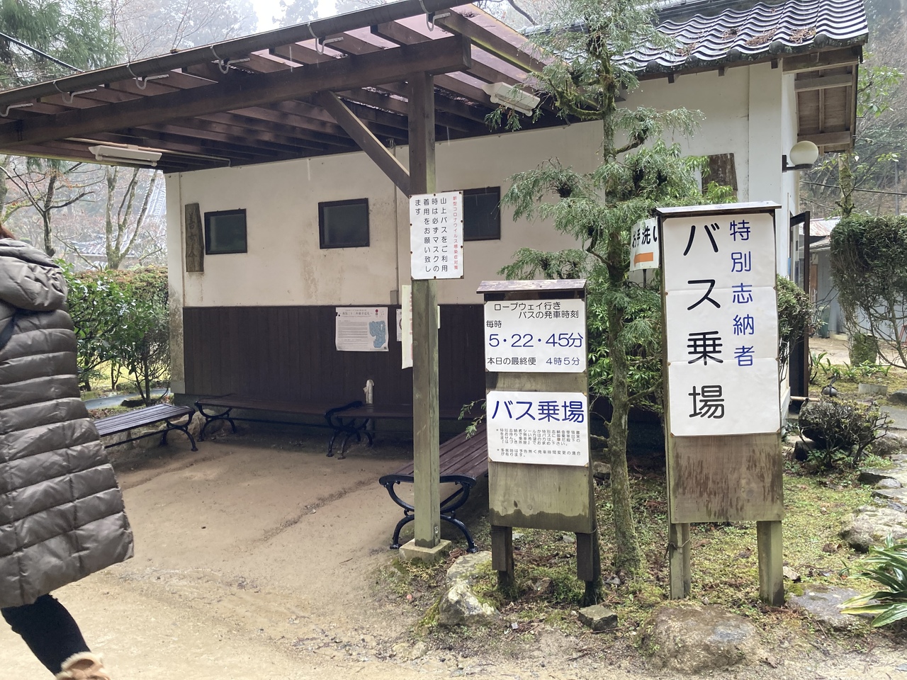 - ロープウェイ下りて拝観料払ってすぐの乗り場から 摩尼殿下バス停まで。復路もここから。