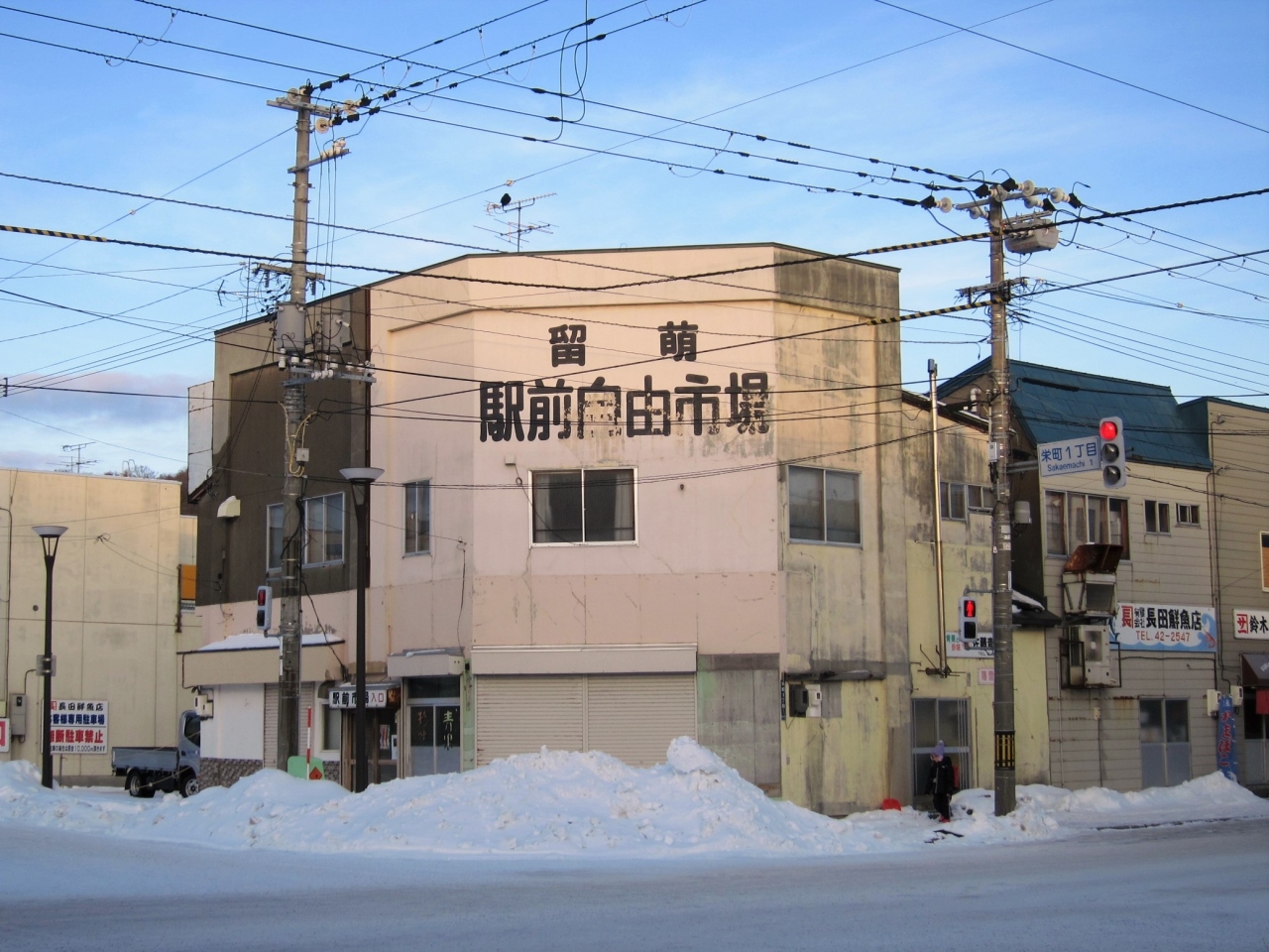 JR留萌駅から徒歩1分と近くて判り易い交差点角に在る昔ながらの市場が「留萌駅前自由市場」です。