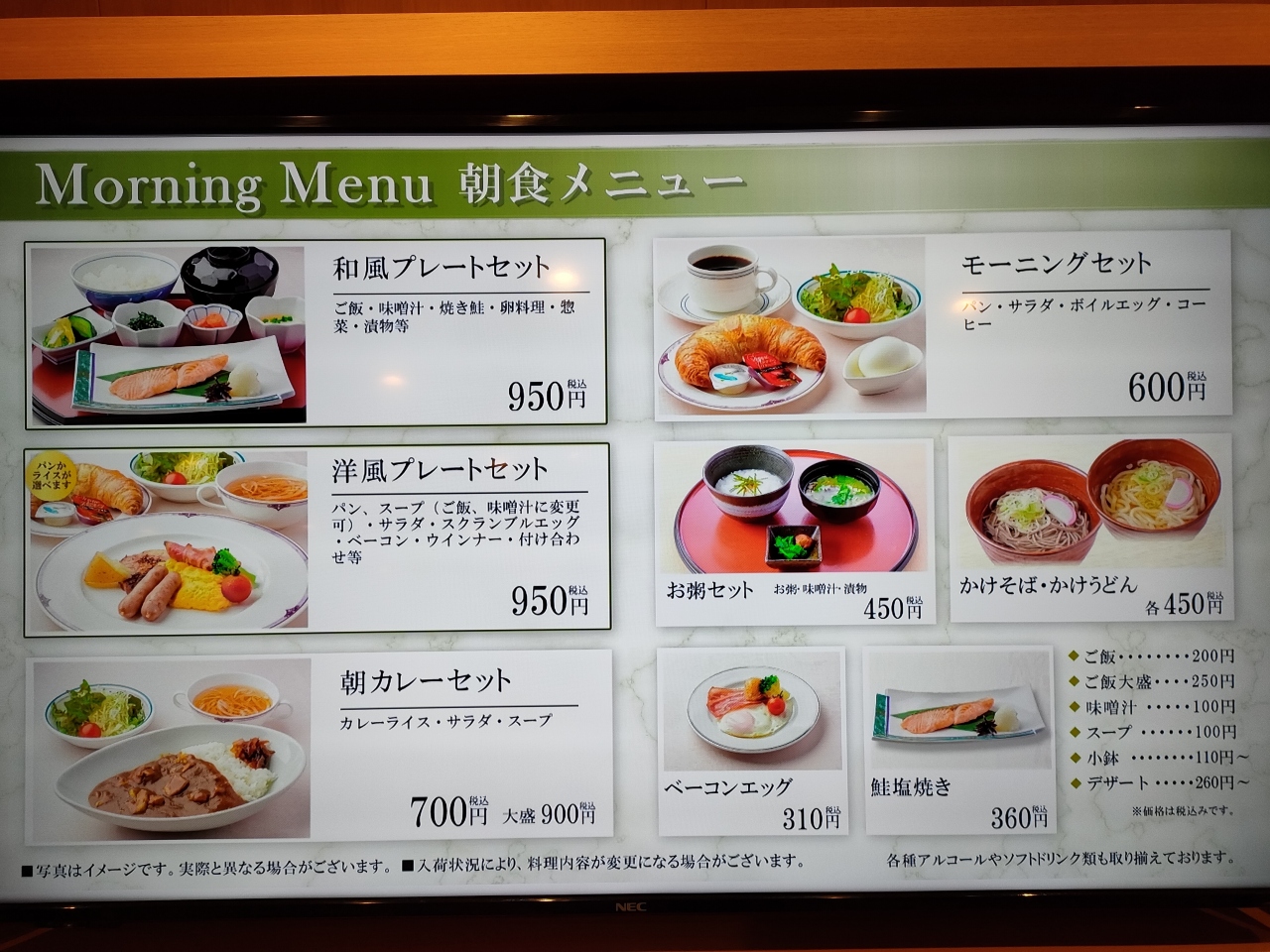 他にも道産ステーキ、とんかつ、お刺身、ジンギスカンと、限られた船内にしては、充実したメニューでした。なお、レストランの開店時間は限られ、17時に小樽出港後、18時開店、19時30分L.O.。朝食は、7時から8時L.O.となっていました。