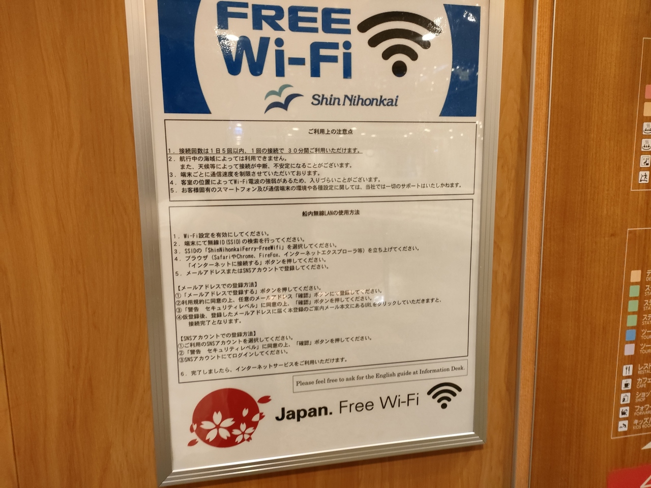 その他、船内ショップでカップ麺やアイスクリームなどが手に入りますが、ショップの営業時間は乗船から17時30分までと、ちょうどレストランL.O.の19時30分から21時まで。翌朝は7時30分から下船30分ほど前の8時30分までとなっていました。
