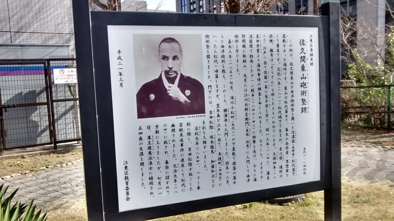 佐久間象山塾跡といってもチンプンカンプンだと思いますが、添付写真のように、しっかり説明板があって、佐久間象山が幕末の兵学者・思想家であって、54歳の時に暗殺されたことを知りました。歴史の詰まった江東区らしい史跡です。