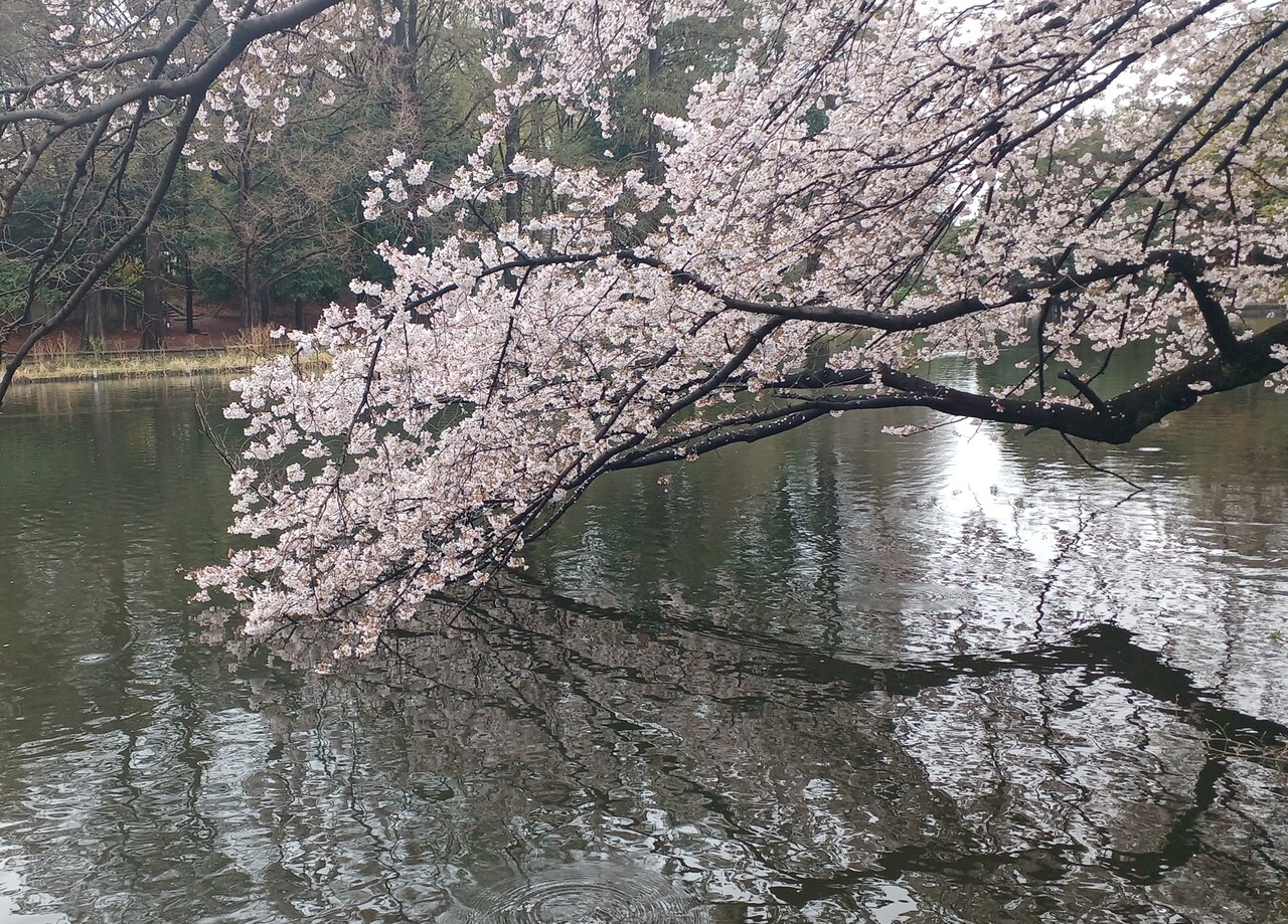 小雨が上がりそうな満開の桜が咲いている石神井公園を散策。シートを広げてお花見していたのは1組のみ。駐車場はガラガラ。石神井池沿い(公園の中ではなく歩道沿い)に満開の桜が。青空なら湖面にも空の青さと桜が映ってキレイだろうな。