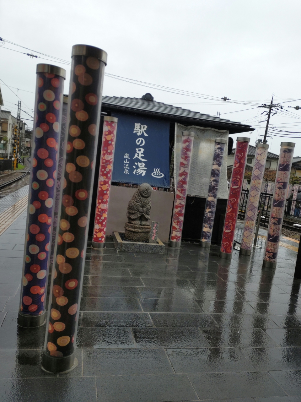 嵐山温泉の湯を使っていては嵐電嵐山駅ホームの内にある。入口からおくにすすんだところ。疲労回復の効果があるというお湯。浸かりながらまわりはキモノフォレストになっているのがみえる。ただ自分がいったときは雨だったので天気わるいとちょっと微妙