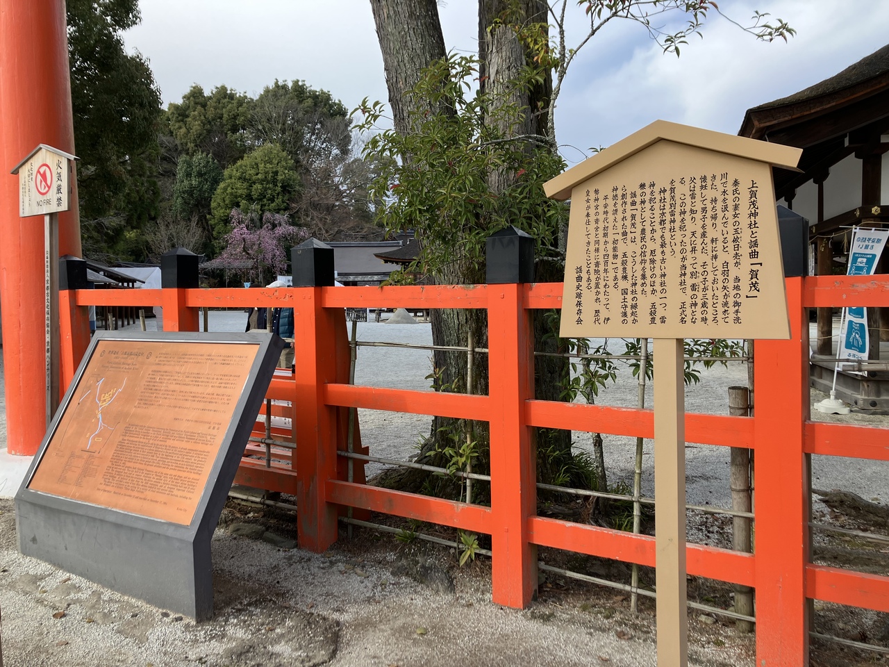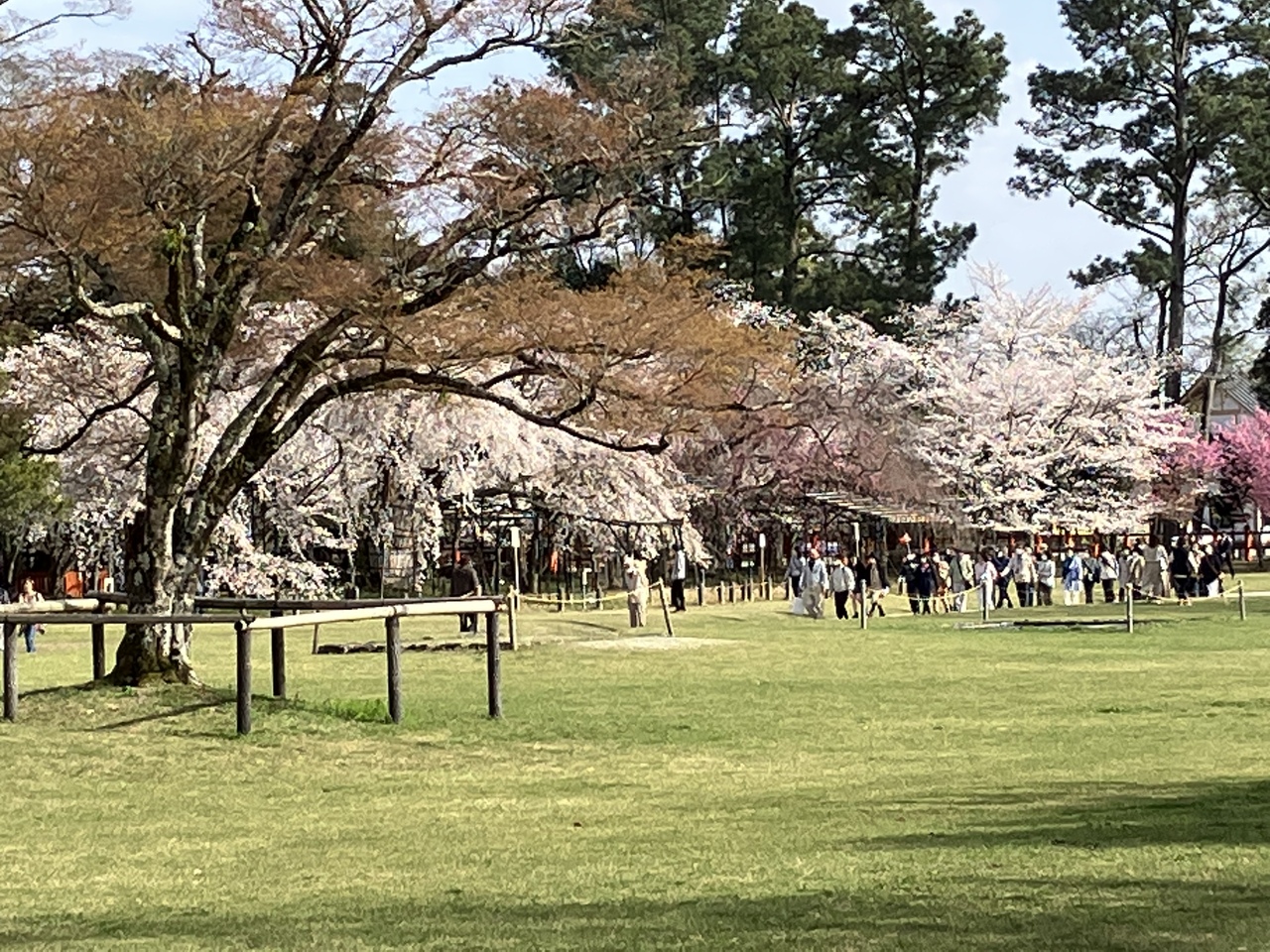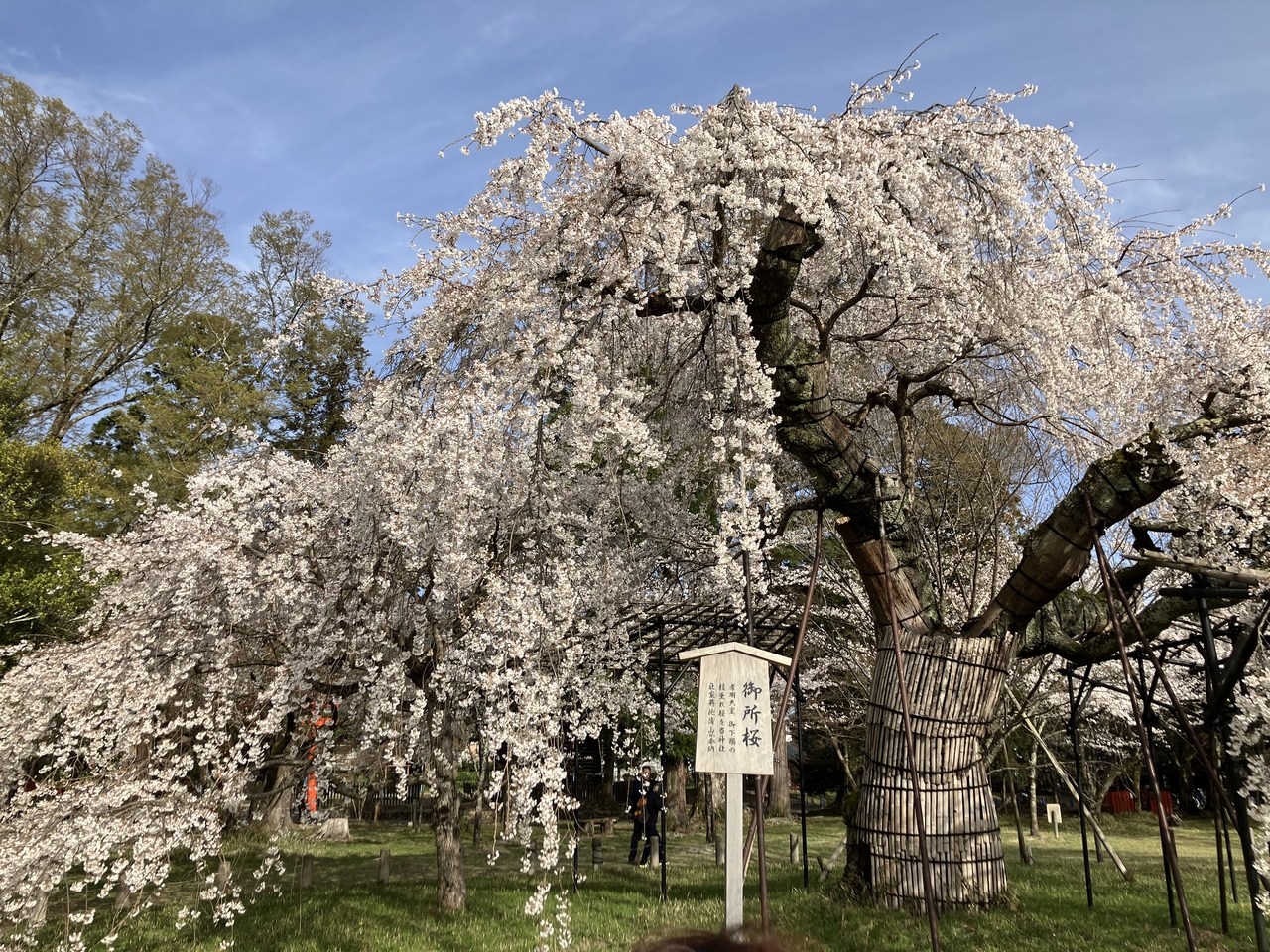 JR「京都駅」烏丸口バスターミナルから4系統の市バスで上賀茂神社下車しすぐです。桜が咲く境内を散策しました。今年は桜の開花が早く、待望の枝垂れ桜も満開でした。遅いくらい。バス停から鳥居を潜り、本殿にかけての右手にある「御所桜」と「斎王桜」は有名な枝垂れ桜で一度お目にかかりたいと思っていました。グッドタイミングで素晴らしい風景を見ることができました。