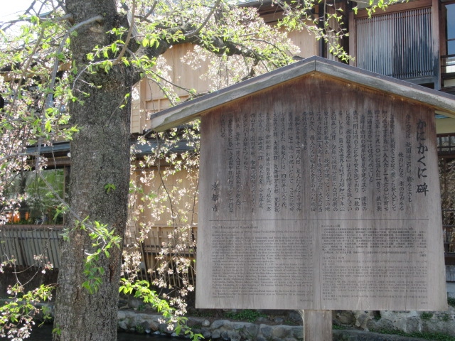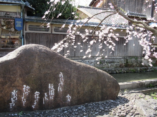 古都を潤す白川南通沿いには水路の桜が彩りを添え訪れる人を魅了しています。その通沿いの土手に「かにかくに碑」があります。桜に見とれていると見過ごしてしまうかも知れませんね。吉井 勇氏をご存じですか。大正、昭和の歌人、脚本家、著作家として多くの作品を残し1960年病気で他界。かにかくに碑には「かにかくに 祇園はこひし寝るときも 枕のしたを水のながるる」と詠まれた歌が刻まれています。吉井勇氏が古希を迎え建てられたそうです。