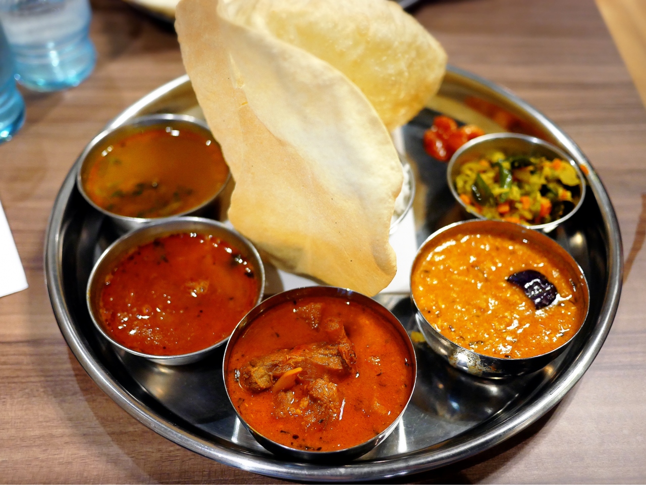 ※カレー2種類、サラダ、バスマティライス、ピクルス、プリ、パパド、サンバル、ラッサム、ポリヤル、ドリンク