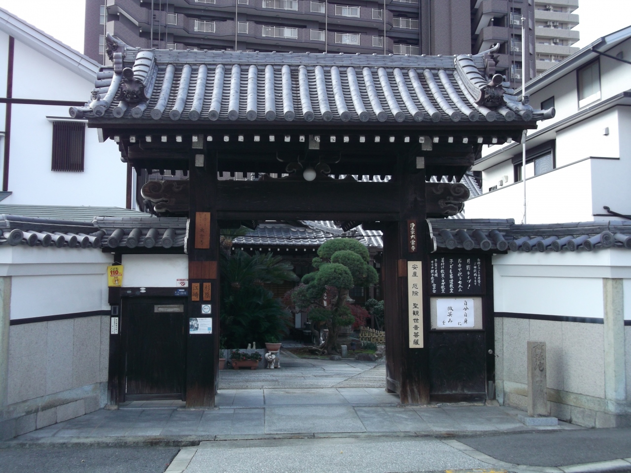 大阪メトロ谷町九丁目駅から歩いて5分ほど、谷町筋から一本入った中寺の通り沿いにある浄土宗の寺院です。このあたりに並ぶ寺院と同様、立派な屋根のある山門とその横に広がる白壁がとても映えて見えます。山門前から境内を眺めると、奥の方に本堂が見えました。お堂の前にはきれいに手入れされた樹木が立ち、落ち着いた雰囲気がありました。
