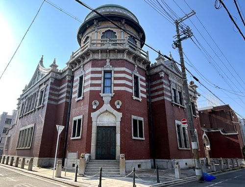 当初は真宗信徒生命保険株式会社本館として建てられたものだそうです。建築年代は1912年(明治45年)で国の重要文化財にも指定されています。仏教関連なのに立派なレンガ造り?と思いますが、設計が築地本願寺や平安神宮も手掛けた伊東忠太の手によると知れば納得します。インド風のドームや六角塔屋が個性的です。