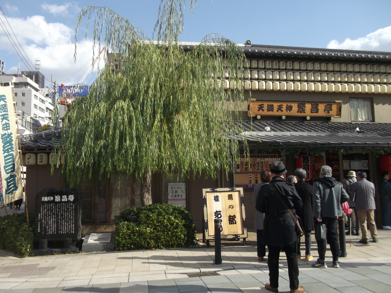 大阪天満宮のすぐ隣にある、上方落語の寄席です。戦災で焼け、61年ぶりに2006年に復活して建てられたものですが、かつての面影を感じさせるいかにも寄席らしい雰囲気が漂う造りになっています。入口には開場を待つ人の行列ができていて、人気のほどが伝わってきました。