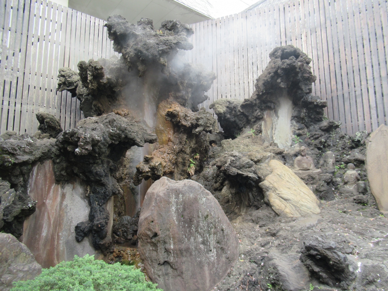 銀座通りの坂を上がっていった先の保育園の向かいにあります。徳川家康が湯治に来たことがあり、以来八代将軍吉宗や十代将軍家治の時代に大湯が度々献上されたそうです。明治に温泉療法が行われました。蒸気が多く噴出した時代もありましたが、休止し現在は人工的に当時の様子を伝えるために湯を噴出していると説明板に記されていました。訪れた時、噴出していなかったので、どこから出るのかわかりませんでしたが、オールコック滞在記念碑や市街電話創始の地碑などを見ていたら、噴出が始まりました。後ろの建物に影響がないように造られた岩石から湯気を出して湯が噴出しました。近くの湯前神社に参拝した後に通るとまだ噴出していました。