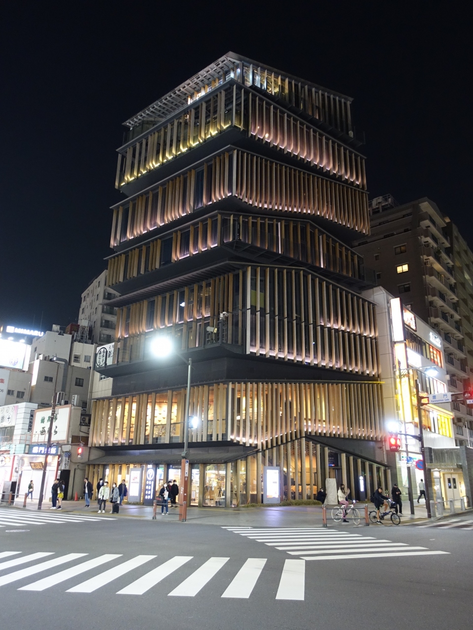 雷門を観光した後、浅草文化観光センターに足を運びました。夜の早い浅草にあって20時まで営業しているのはありがたいです。雷門側から見るとスクランブル交差点の向うに建ち、照明が灯された姿は昼にもまして存在感抜群です。隈研吾氏の設計によるもので、緻密に計算された美しさだと感じました。
