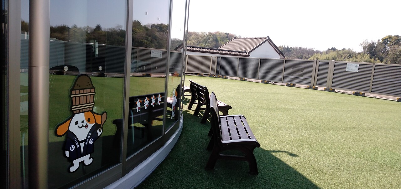 人気のあるSAのようで、1階にあるお土産屋さんや飲食店はとてもたくさんの人がいました。2階に行ける階段があったので行ってみたら、人工芝が敷かれたルーフガーデンがあり、ベンチもあって、しかも人もほとんどおらず、1階の混雑具合からは想像できないほど静かでした。