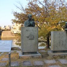 原爆ドームの近くの川沿いにある碑 胸像の肩には鳥が、、、