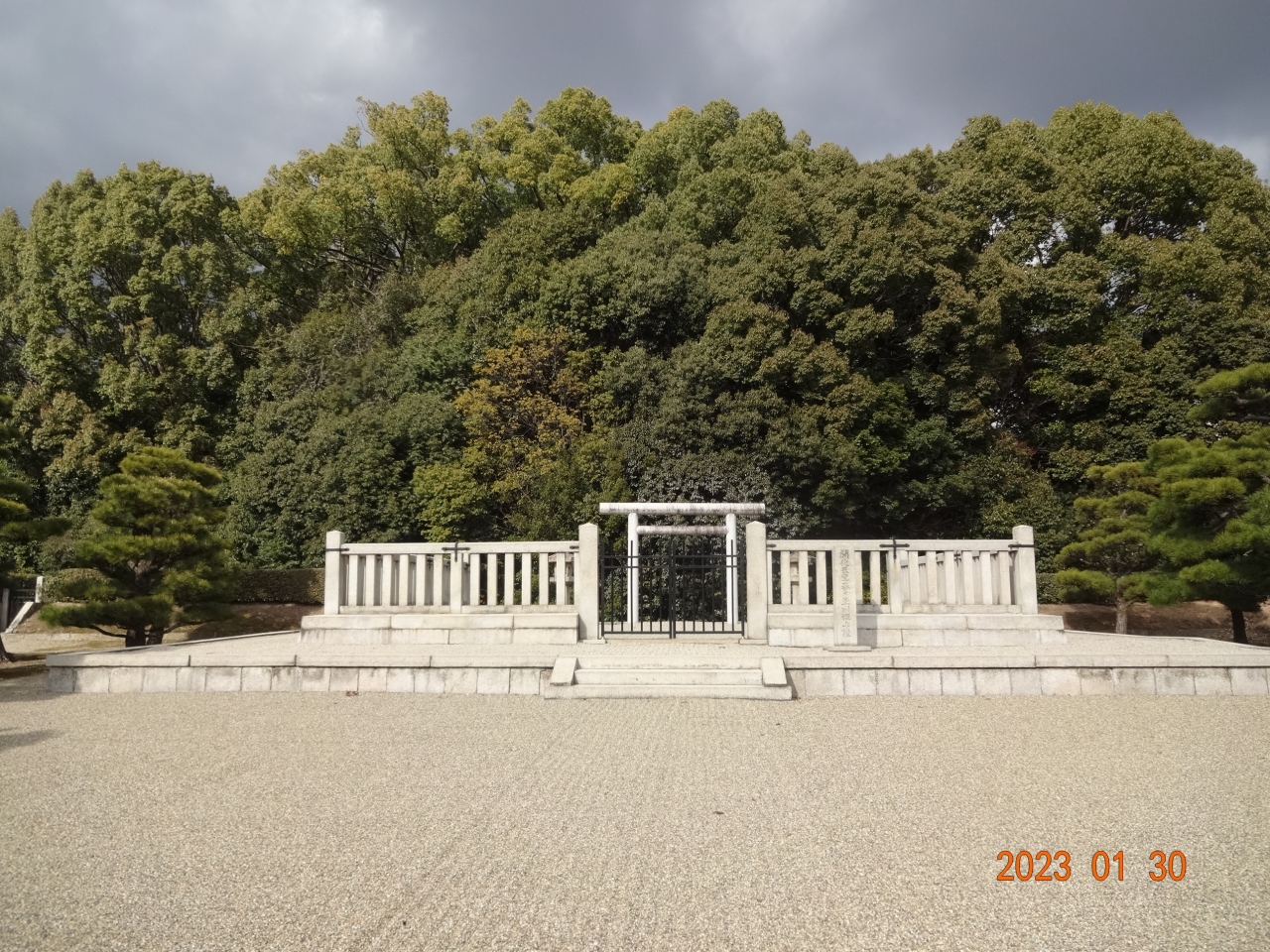 三条通り沿いに天皇陵への入口があって、細い参道(?)が続いていました。奥まで歩いて行ってみました。三条通りには、たくさんの観光客が歩いていましたが、こちらまで来る人はいませんでした。静かな場所です。
