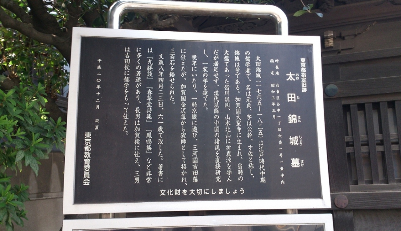 東京メトロ千代田線根津駅から徒歩7~8分程度、台東区谷中1丁目の日蓮宗寺院・一乗寺の墓地にあります。今まで知りませんでしたが、大田錦城は江戸時代中期に活躍した儒学者で、お墓は東京都の旧跡に指定されています。大田錦城と一乗寺の関係は調べきれませんでした。