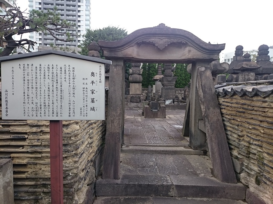 京浜急行線青物横丁駅から徒歩10分程度、品川区南品川4丁目の臨済宗大徳寺派寺院・清光院の墓地にあります。土塀で囲まれた墓域に大分県中津藩主の奥平家の墓石88基がありました。近くに似た名前の日蓮宗寺院・清光寺が有りますが、奥平家のお墓があるのは臨済宗寺院・清光院の方です。お間違えの無いように。