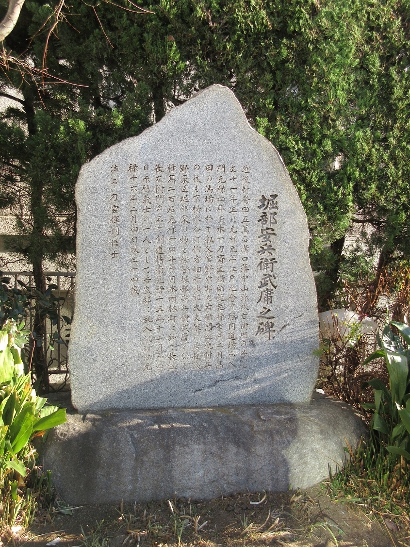 茅場町から新川界隈を散策した際、亀島川にかかる【亀島橋】のたもとに、【堀部安兵衛武庸之碑】が置かれていました。古い石碑ではないのですが、漢字が多く非常に読みにくいのですが、赤穂浪士の一人である堀部安兵衛がこの地に居を構えていたことは何とか理解できました。両国国技館界隈にも赤穂浪士関連の史跡がありますし、隅田川に近いこのあたりが江戸時代の歴史の舞台となっていたことを知り、感慨深く感じました。
