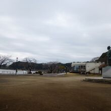 千波湖の西側に広がる千波公園。ガラス張りのカフェ、好文カフェの近くに隠居姿の水戸黄門で知られる水戸藩第2代藩主徳川光圀公の像の銅像が立っています。割と新しい像に見えます。千波湖とその向こうの水戸城跡の方を向いて凛として立っているように見えます。