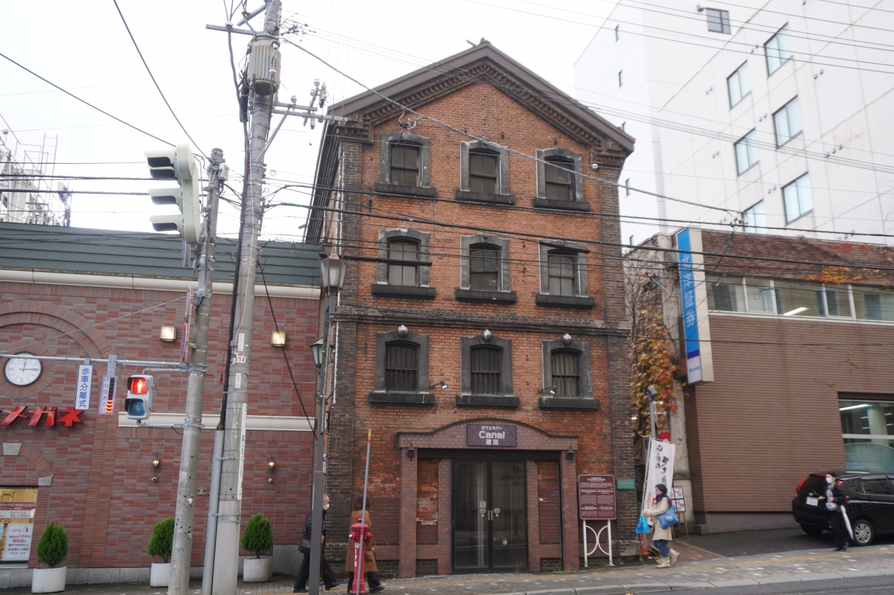 旧向井呉服屋支店倉庫は、日銀通りを上がりきったサンモールの入り口横。明治40年築の煉瓦造4階建の建物で、小樽市指定歴史的建造物第73号。縦長の建物ですが、正面二階から四階まで3つずつ9個の窓が並んで、それが独特のデザイン。レンガ造りは耐火の意味があるのでしょうが、一方で窓をこれだけ多く作って自然光の明かりも取る。相反するようなコンセプトかもしれません。