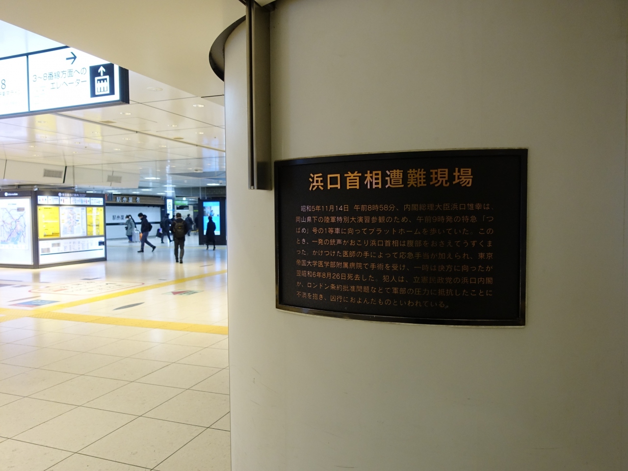 JR東京駅構内に「浜口首相遭難現場」なる箇所があると知り、東京駅で下車した際に訪問してみました。驚いたのは、在来線から新幹線に乗り換える際に何十回と通っている場所だったことです。柱の一つには説明書きのプレートが埋め込まれていますが、今まで全く気づきませんでした。こんな場所で銃撃事件が起きたというのが信じられない思いです。