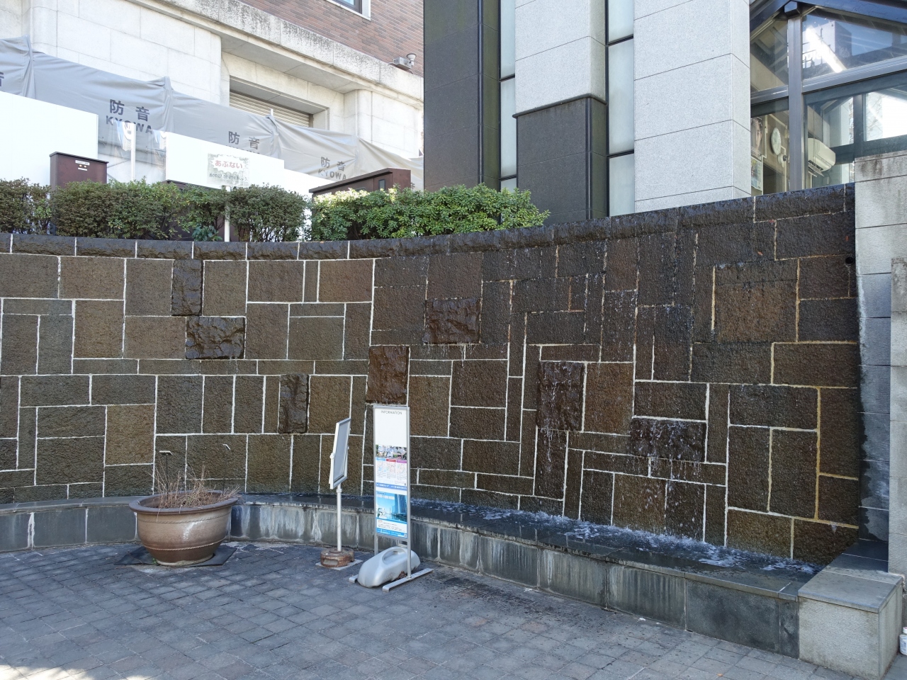 中央通りを北上し、日本橋川の手前で階段を降りたところに「滝の広場」があります。広場とは言っても狭いスペースで、壁面を伝わって水が落ちてくる仕掛けがあるので「滝の広場」と名づけられているのだと思います。ここからは日本橋を側面から間近に眺めることが出来、迫力ある光景を楽しむことが出来ます。