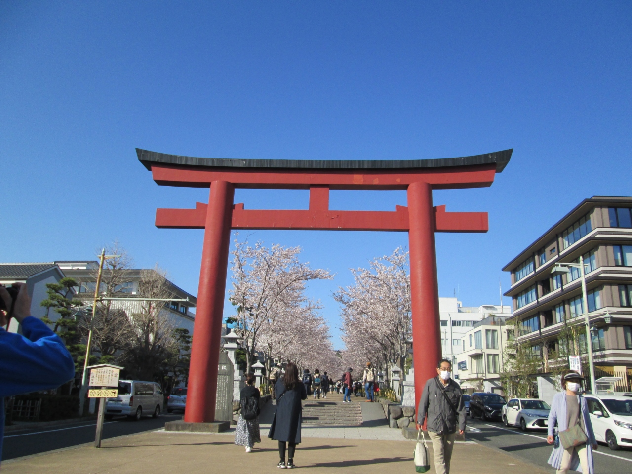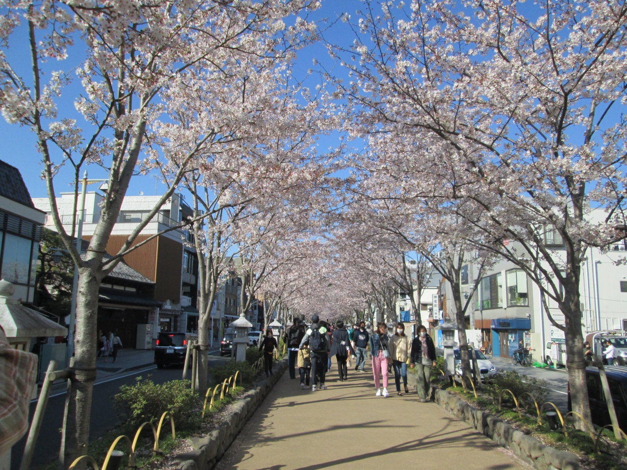 六国峠ハイキングコース・天園・鎌倉散策で最後は若宮大路を歩きました。頼朝が妻政子の安産を祈って築かせた鎌倉八幡宮二の鳥居から南南西の一の鳥居まで走る大通りを若宮大路といい、この大路の中央に一段高い道があり、これを壇葛という。この壇葛の両脇に植えられている桜が今満開で綺麗でした。壇葛の左右の自動車道は高さに差異があり、八幡宮に向かって右側が高く、左側は低くなっています。右側(高い側)には武家屋敷、左側は庶民町だったそうです。道の高さが違うことを友達から聞き初めて知りました