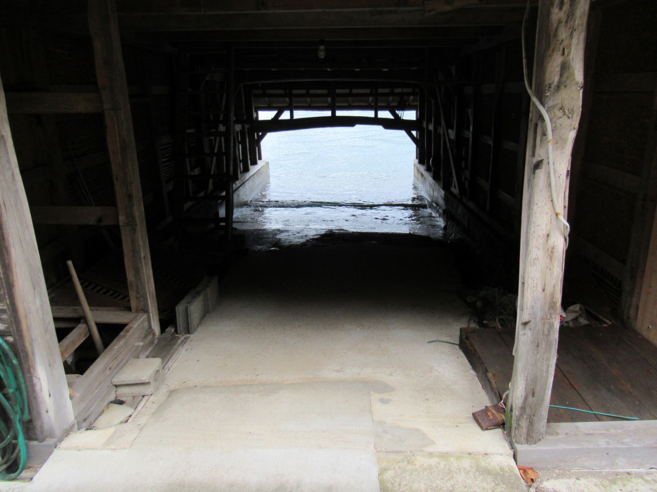 母屋が道路を挟んで海際に建てられており、1階では出漁の準備や道具の手入れなどを行い、2階は居間や民宿等に活用されている独特の造りになっています。